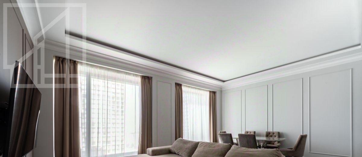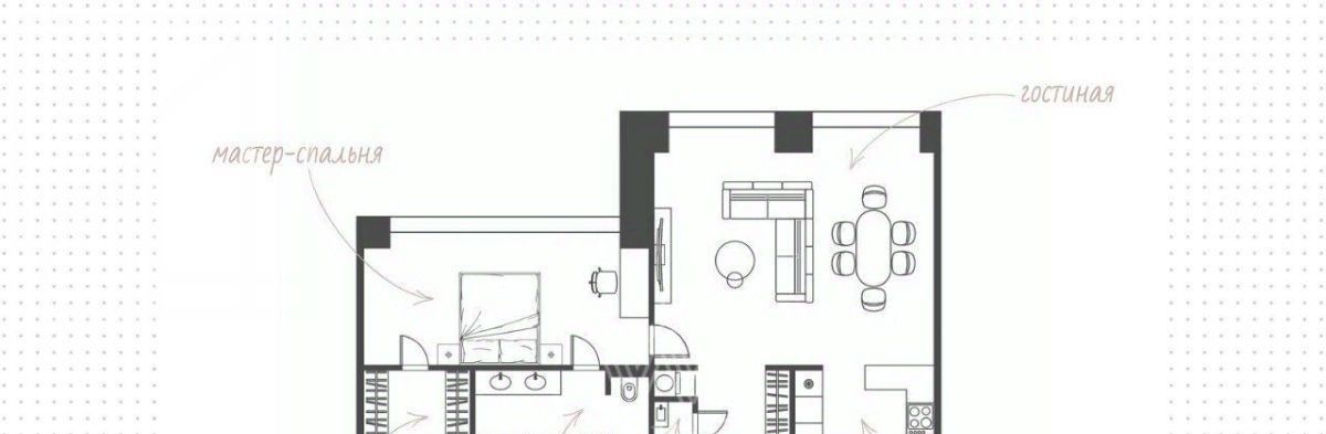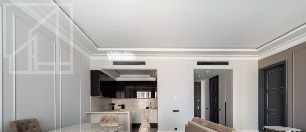 Планировка: гостиная-кухня с обеденной зоной, мастер-спальня с санузлом (ванна, душ, туалет) и гардеробной, гостевой туалет, прихожая с встроенными шкафами. Есть вся необходимая мебель и бытовая техника. Дизайнерская отделка в стиле современной классики. Вид из окон на благоустроенный закрытый двор-парк с фонтанами.