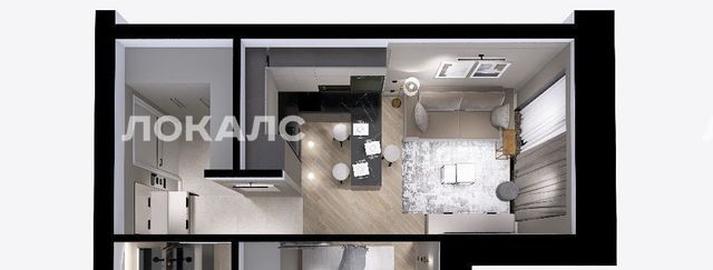 - кухонный гарнитур со всеми необходимыми бытовой техникой и барная стойка с тремя стульями;