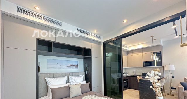 - спальная зона закрывается раздвижной стеклянной перегородкой, кровать с подъемным механизмом 160/200, дизайнерский стол для макияжа;