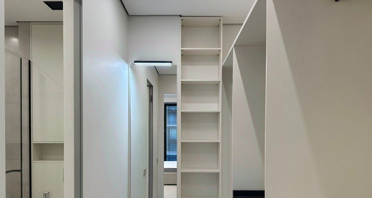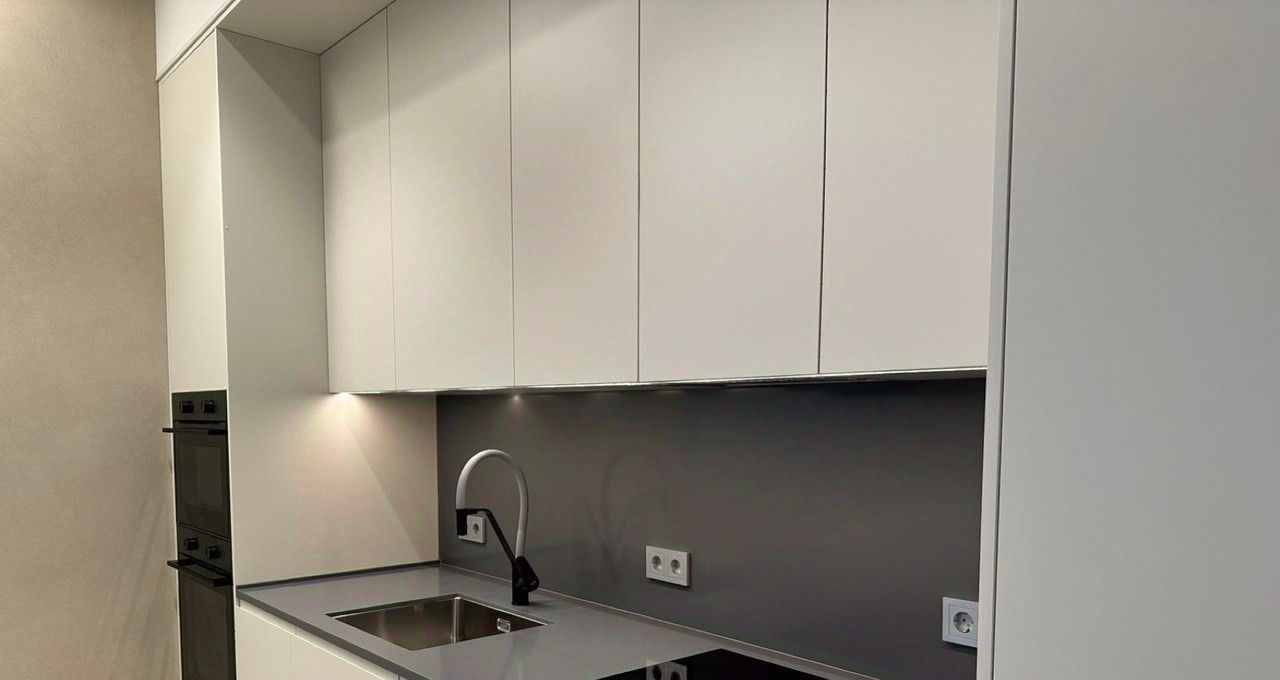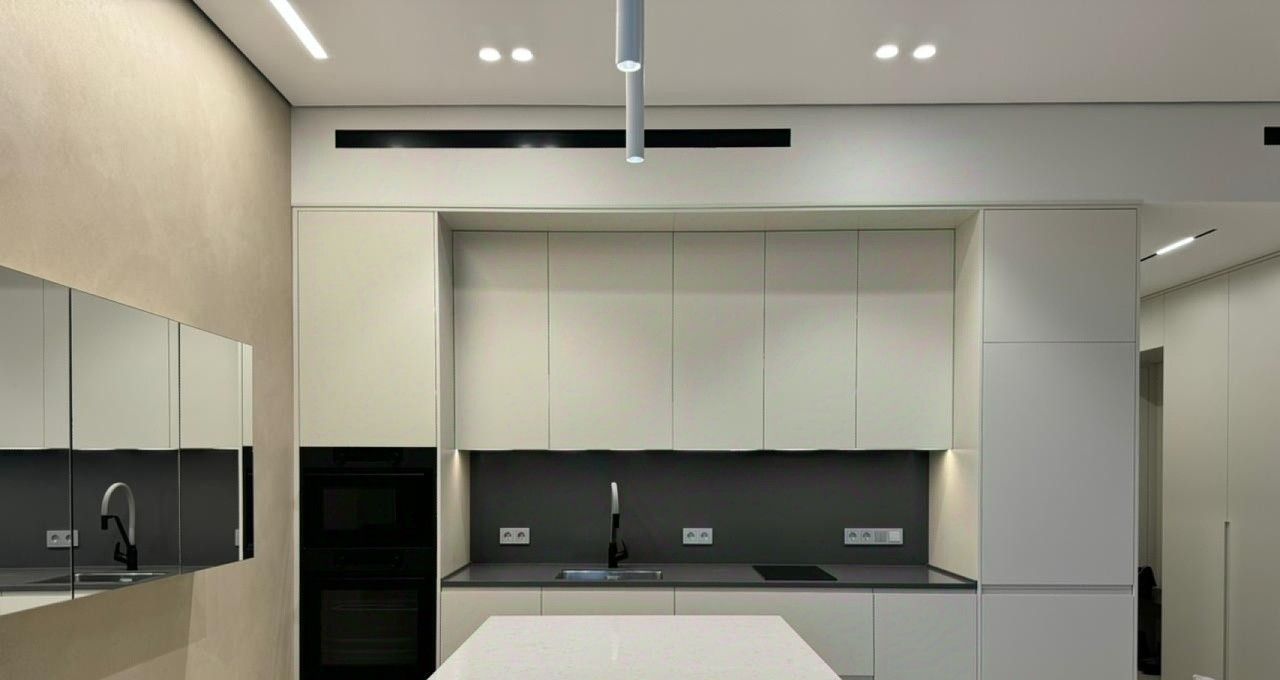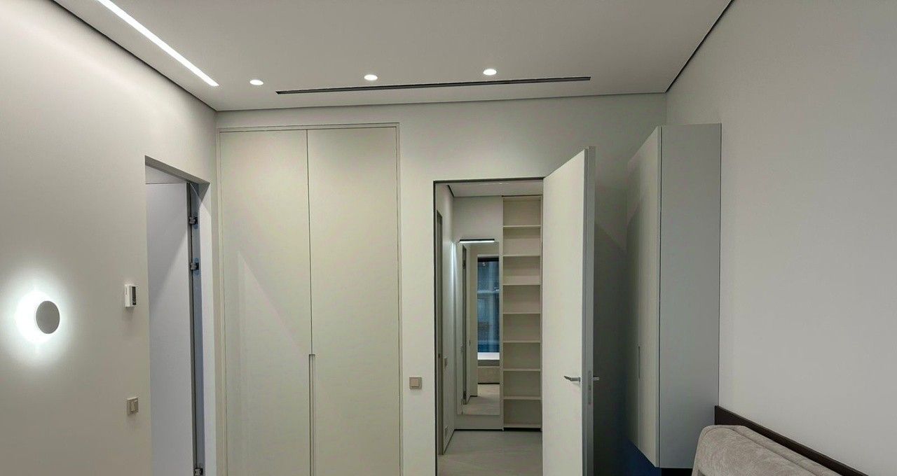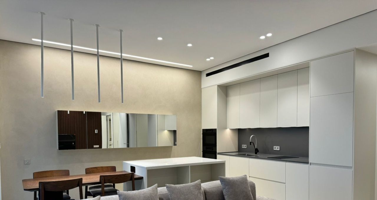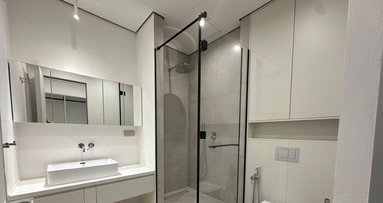 Современная евро-отделка премиум-сегмента (нейтральная палитра, качественные материалы: плитка, окрашенные стены, натяжные потолки).