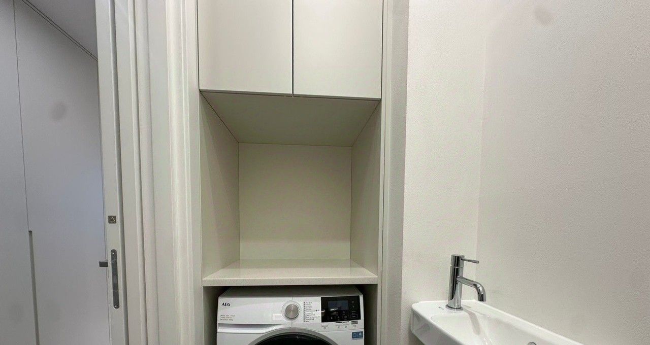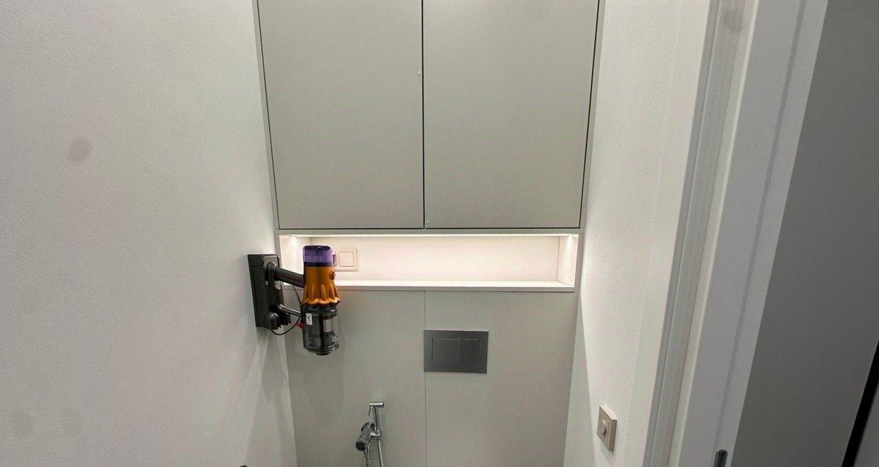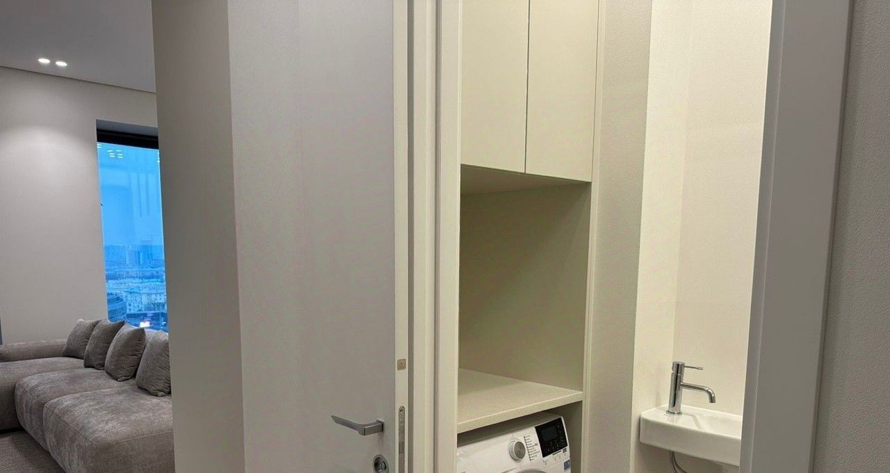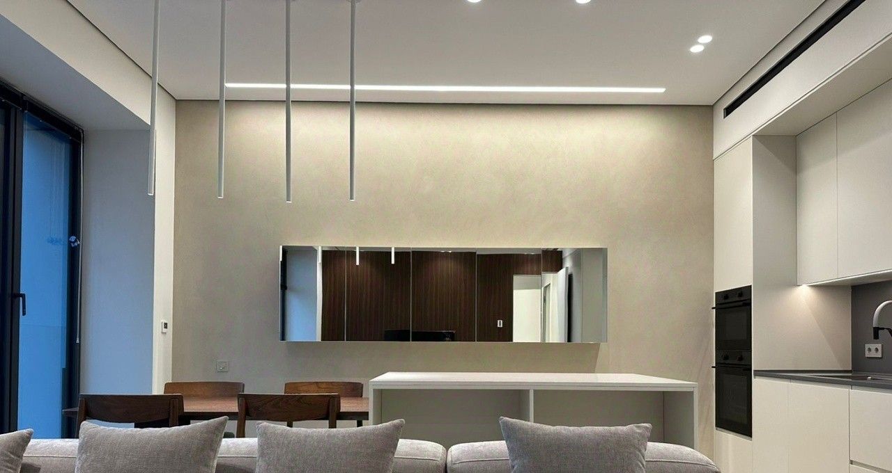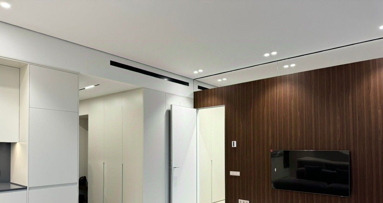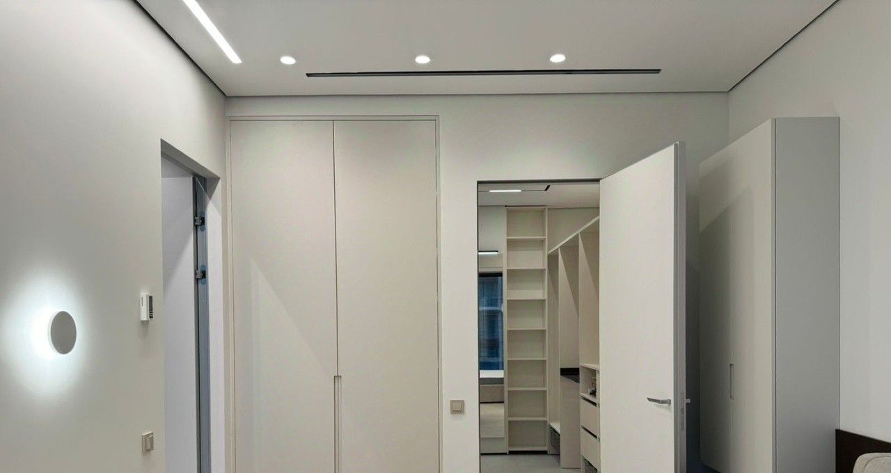 Современная евро-отделка премиум-сегмента (нейтральная палитра, качественные материалы: плитка, окрашенные стены, натяжные потолки).