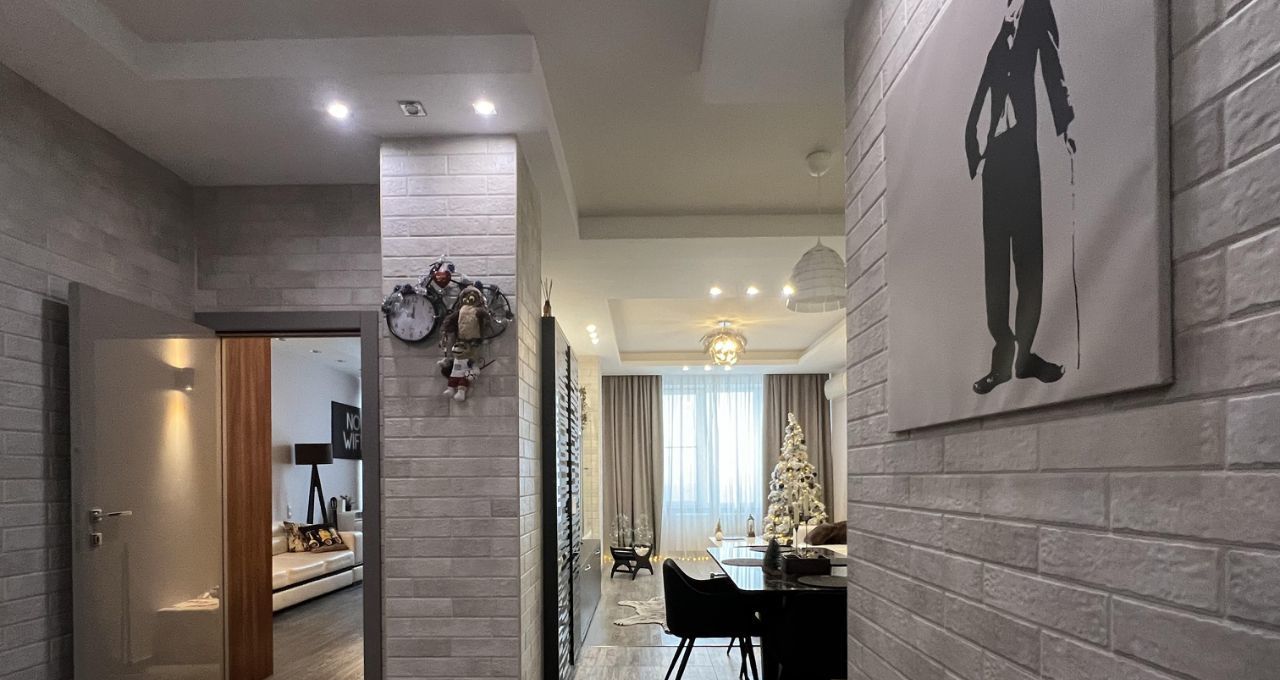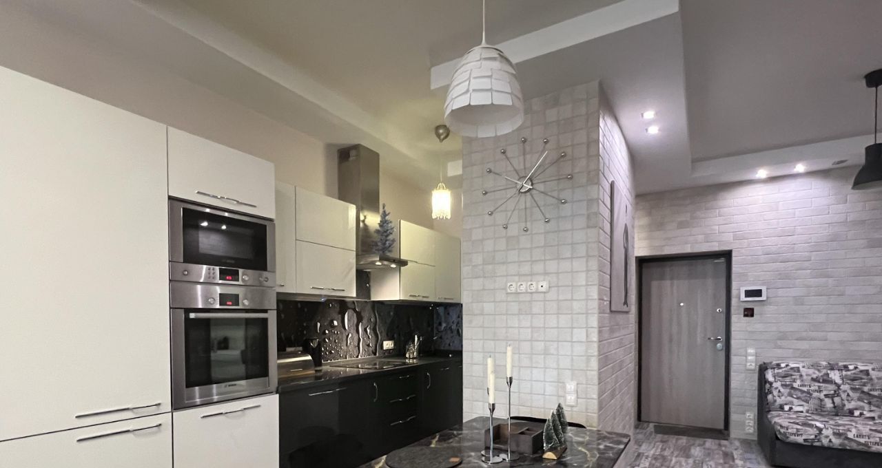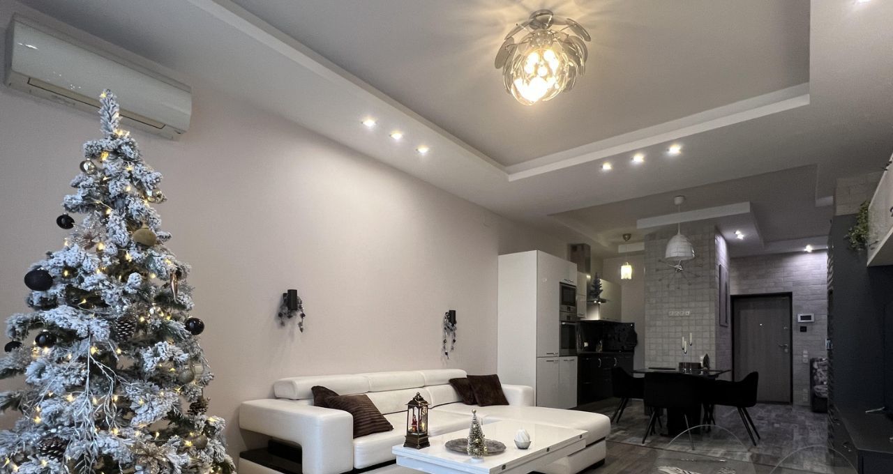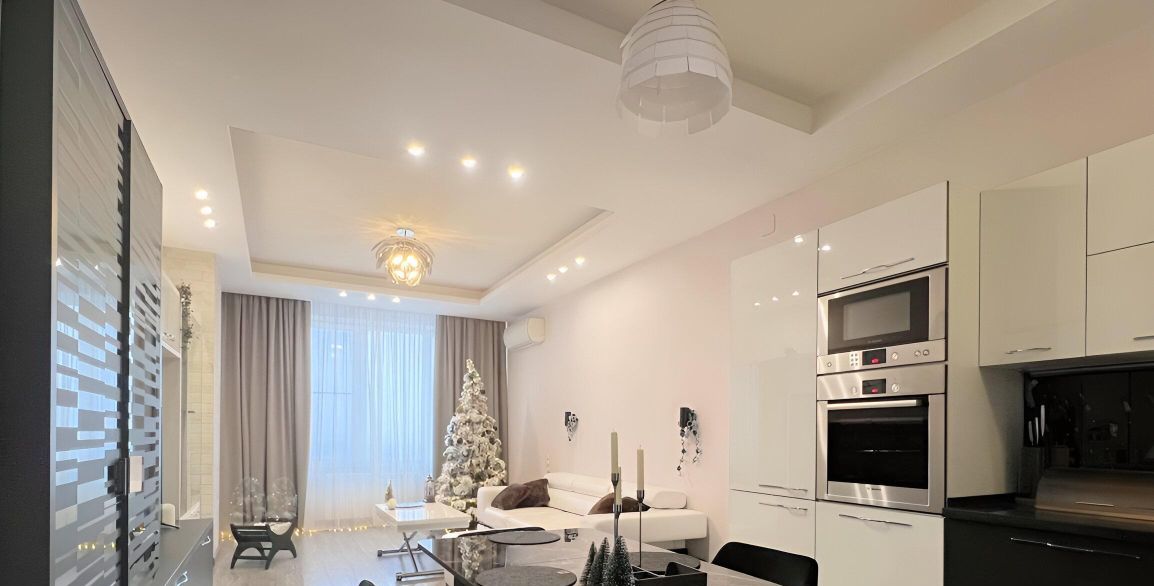 Просторная совмещенная гостиная-кухня: светлое помещение с обеденной зоной. На кухне установлен полный комплект встроенной техники, включая посудомоечную машину и кофемашину, что делает жизнь максимально удобной.