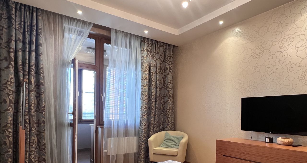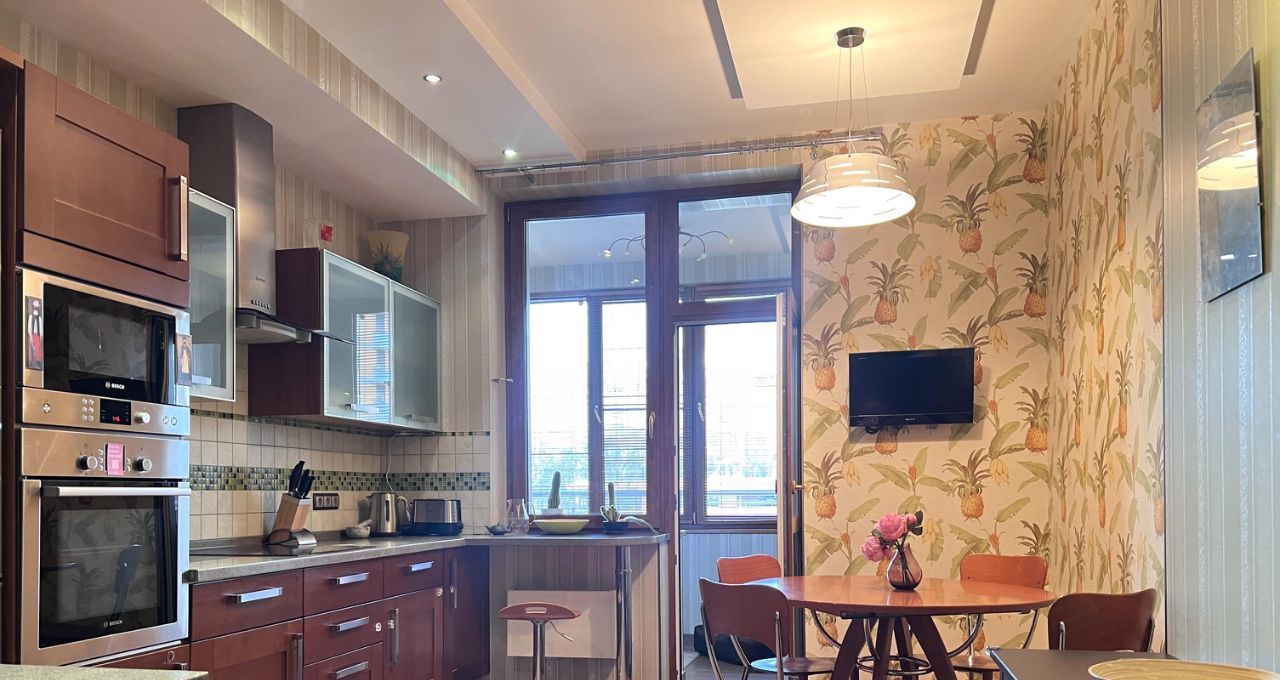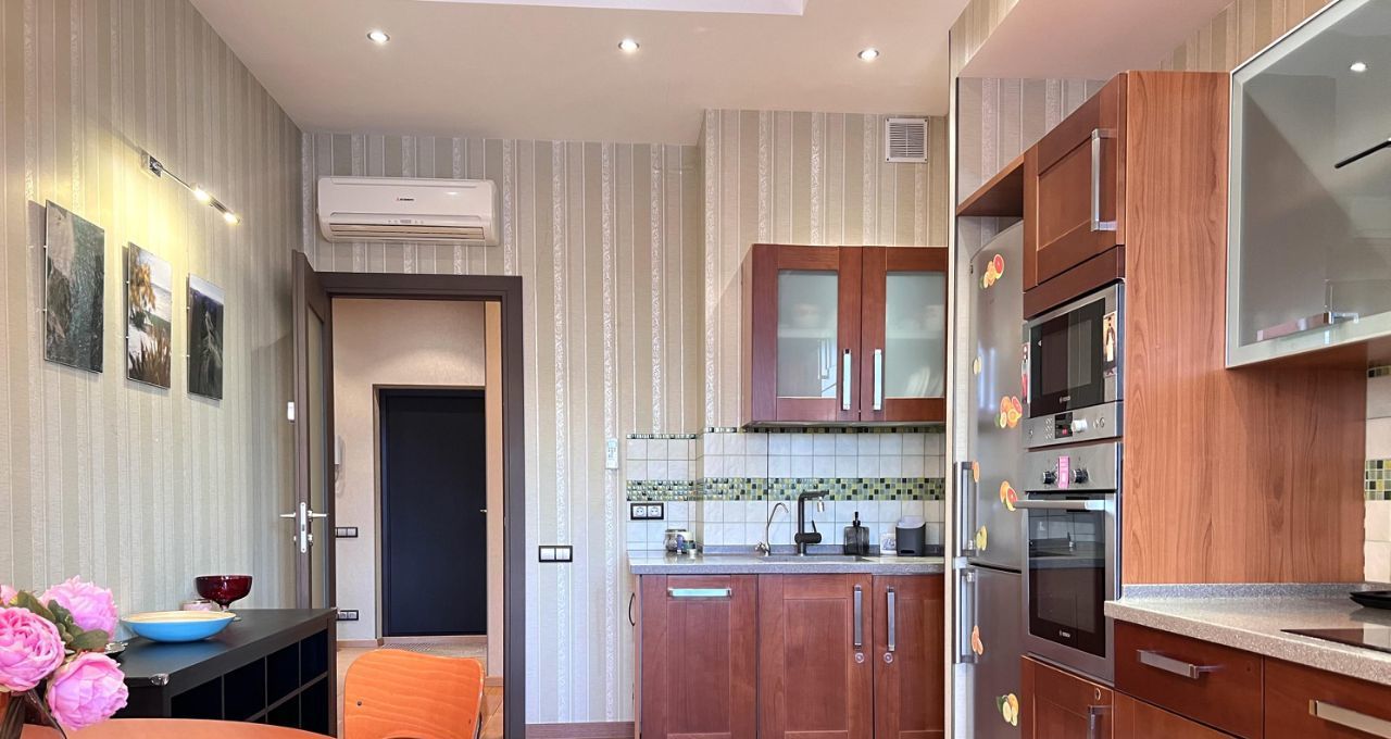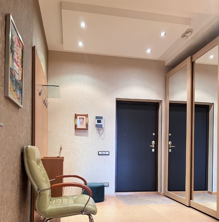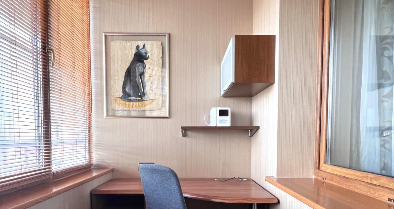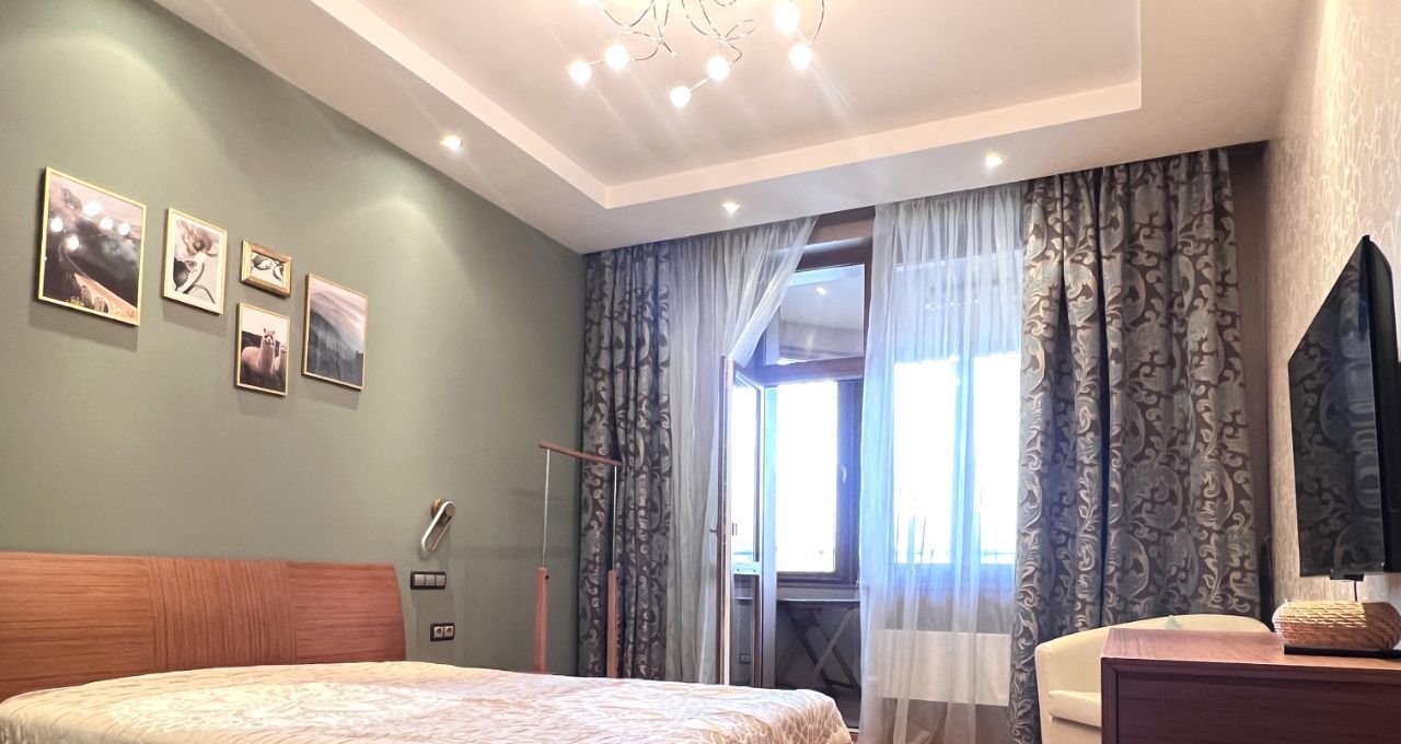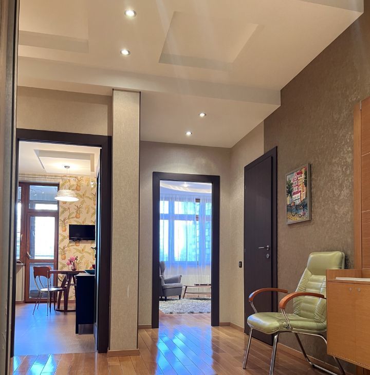 Квартира общей площадью 103 кв.м., с просторной кухонной зоной и всей необходимой техникой, спальной комнатой, гостиной, двумя утепленные лоджиями с рабочей зоной. Два санузла с ванной и душевой кабиной, гардеробная комната. На полу деревянная доска, установлены кондиционеры.