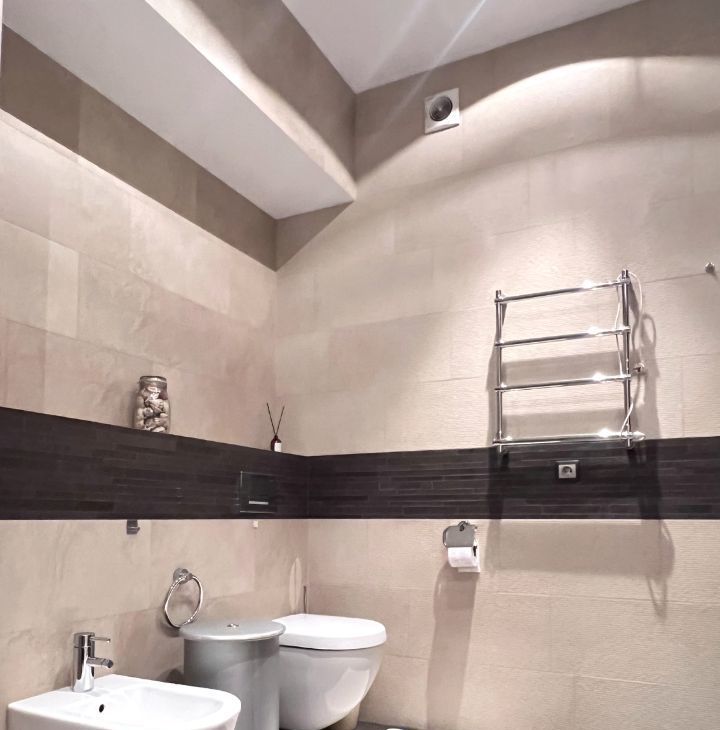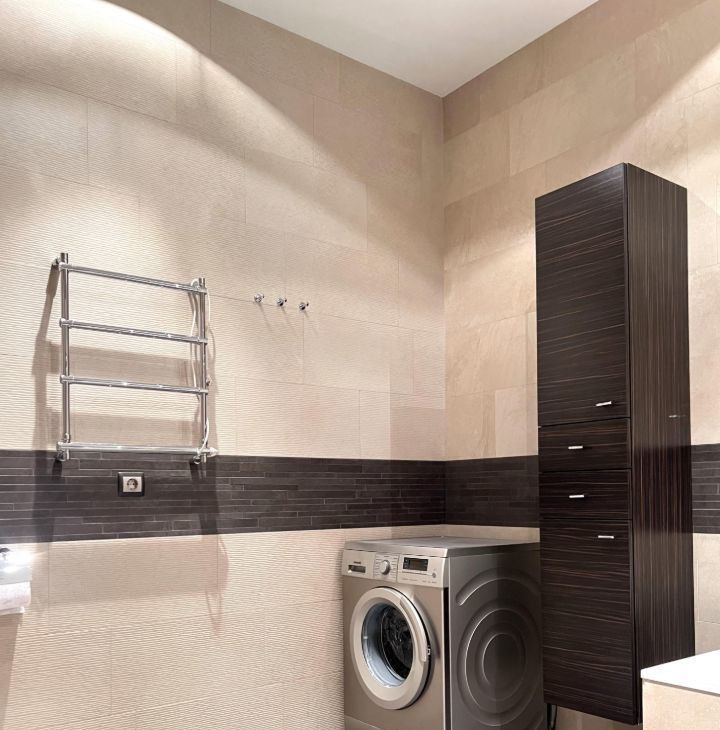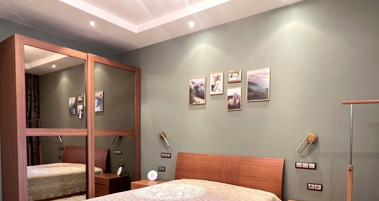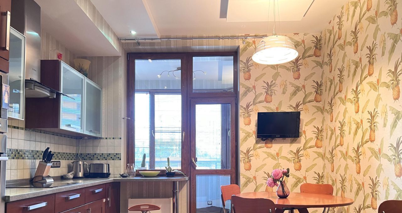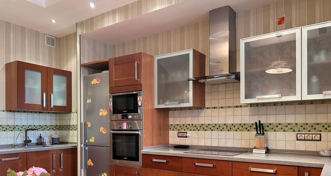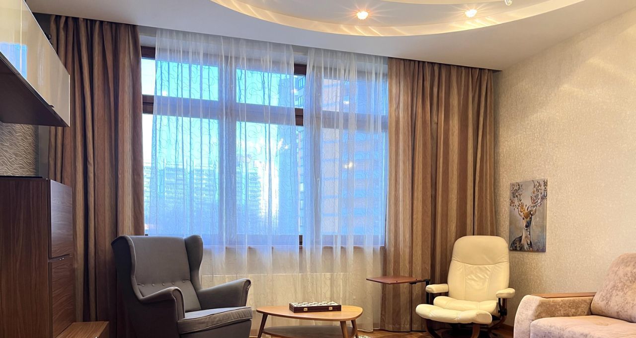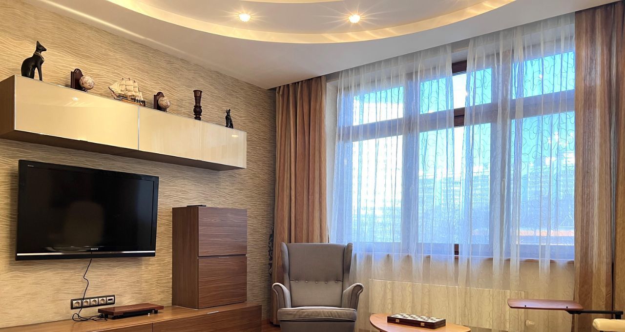 Квартира общей площадью 103 кв.м., с просторной кухонной зоной и всей необходимой техникой, спальной комнатой, гостиной, двумя утепленные лоджиями с рабочей зоной. Два санузла с ванной и душевой кабиной, гардеробная комната. На полу деревянная доска, установлены кондиционеры.