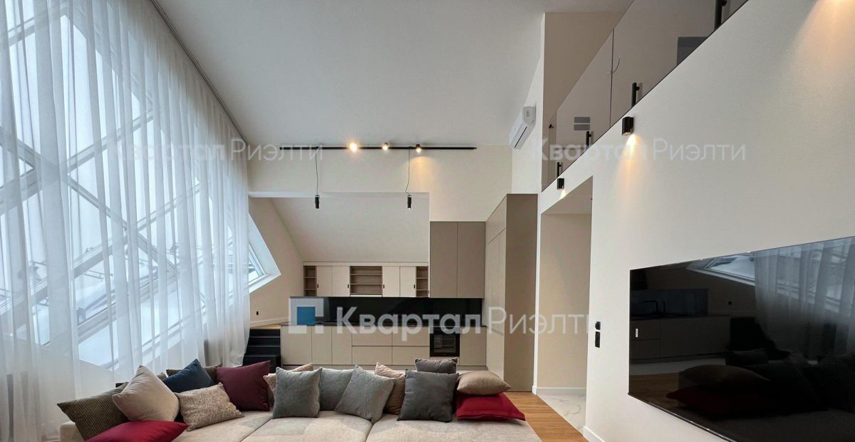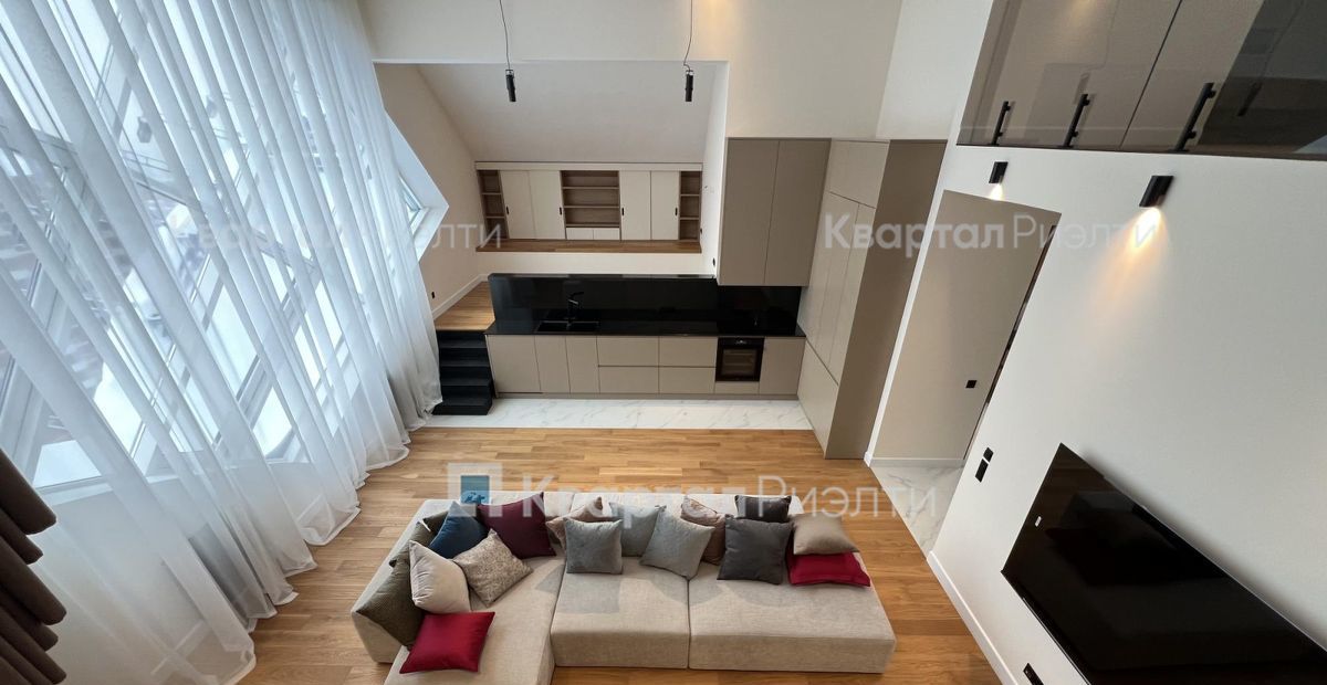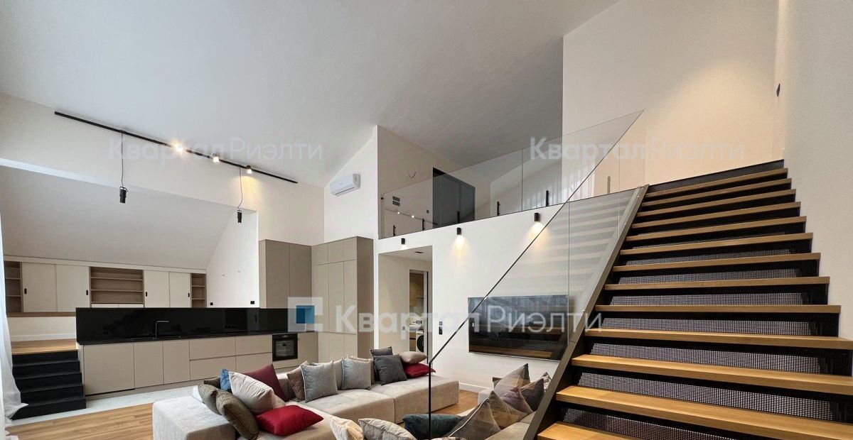 На первом уровне расположены прихожая со встроенным шкафом для верхней одежды, гостевой санузел со стиральной машиной, кухня-гостиная со вторым светом, шестиметровым потолком и панорамным радиусным окном с потрясающим видом на центр Москвы, дополнительная зона отдыха (или кабинет при необходимости). На втором уровне расположены спальня, ванная и большая гардеробная. На второй этаж ведёт удобная широкая лестница.