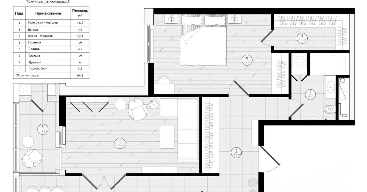 3. Мебель: Вся необходимая мебель, кровать King-size (200х200 см), большие встроенные шкафы, массажное кресло.