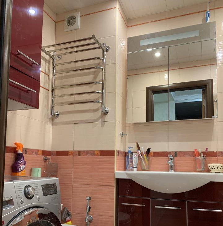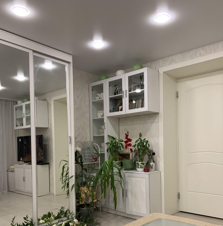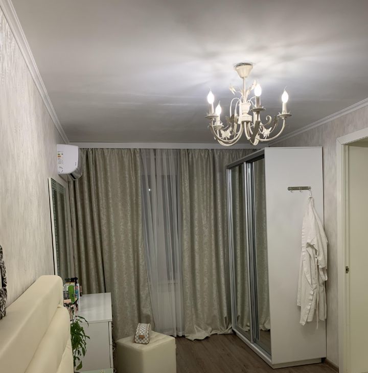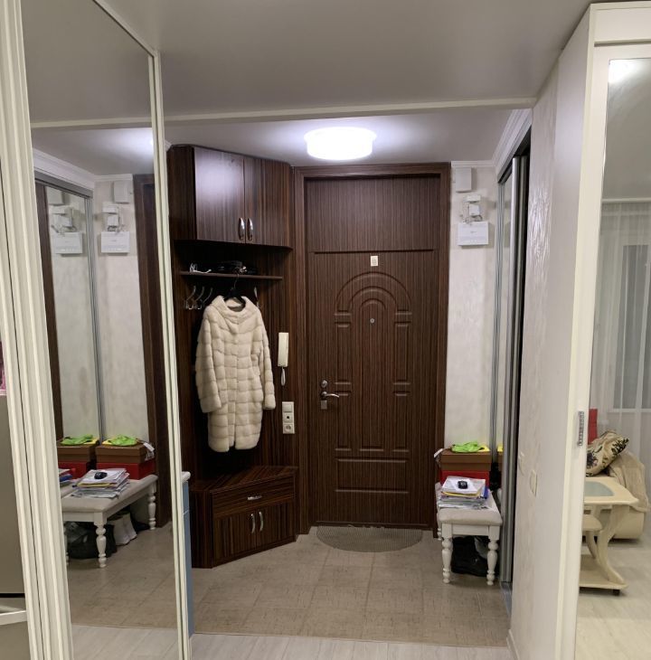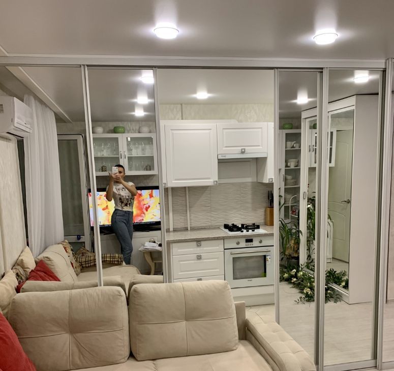 Комнаты: спальня 13,7м2, зал объединен с кухней, 17,4 + 9м2, что делает квартиру по ощущению при входе очень просторной, тем не менее между залом и кухней установлена зеркальная раздвижная перегородка. несомненным преимуществом квартиры является наличие гардеробной комнаты при входе слева. Большое количество зеркал дополнительно расширяет пространство. Есть шкаф для обуви. Дом строился по экспериментальному проекту, поэтому стены очень толстые, шумоизоляция великолепная, тихо, соседи хорошие, интеллигентные люди.