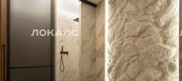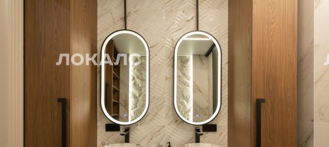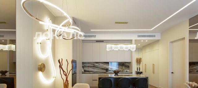 Отделка санузлов выполнена крупноформатным керамогранитом, установлена встроенная сантехника. Также санузлы и гардеробная в прихожей оснащены теплыми полами. Вся корпусная мебель выполнена на заказ у ведущих производителей мебели. Столешница на кухне и острове из керамогранита. Встроенная система кондиционирования. Управление светом и шторами с помощью умногодома.