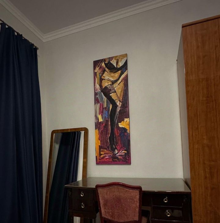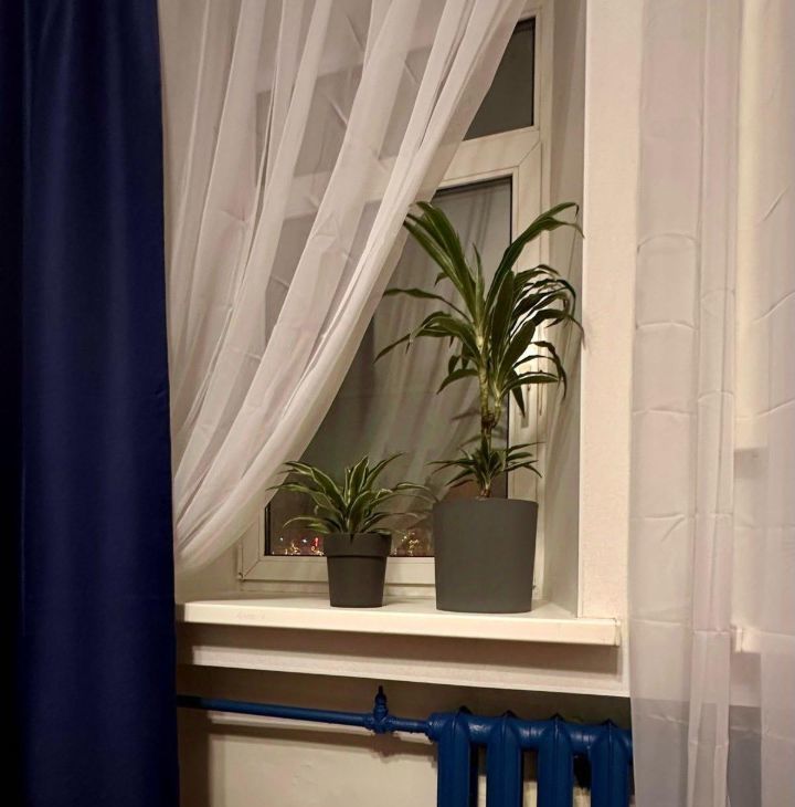 Гостиная наполнена мягким светом, тактильными тканями и авторскими художественными работами. Широкие подоконники с живыми растениями усиливают ощущение дома и замедленного ритма.