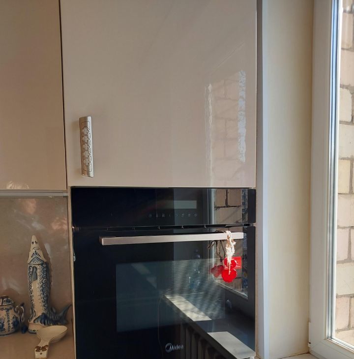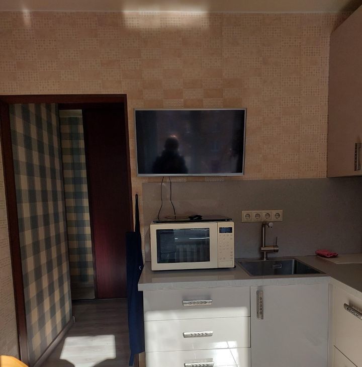 На кухне газ, доводчики на шкафах, рабочая вытяжка, второй свет над рабочей зоной, встроенный духовой шкаф, холодильник Siemens, микроволновка, телевизор Samsung.