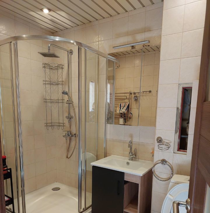Ванная совмещена с туалетом, душевая кабина с тропическим душем, стиральная машинка Haier.