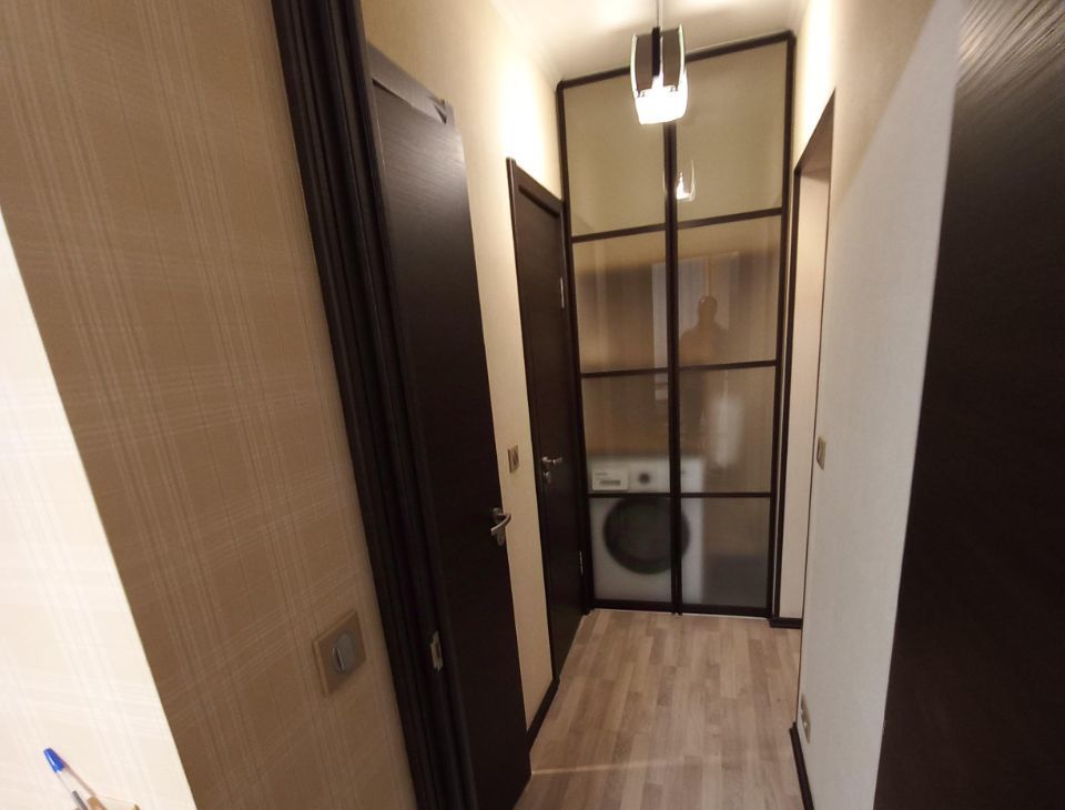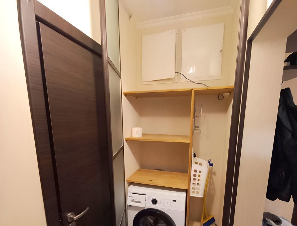 В коридоре имеется хозяйственный шкаф с полками для хранения различных принадлежностей, здесь же установлена стиральная машина.