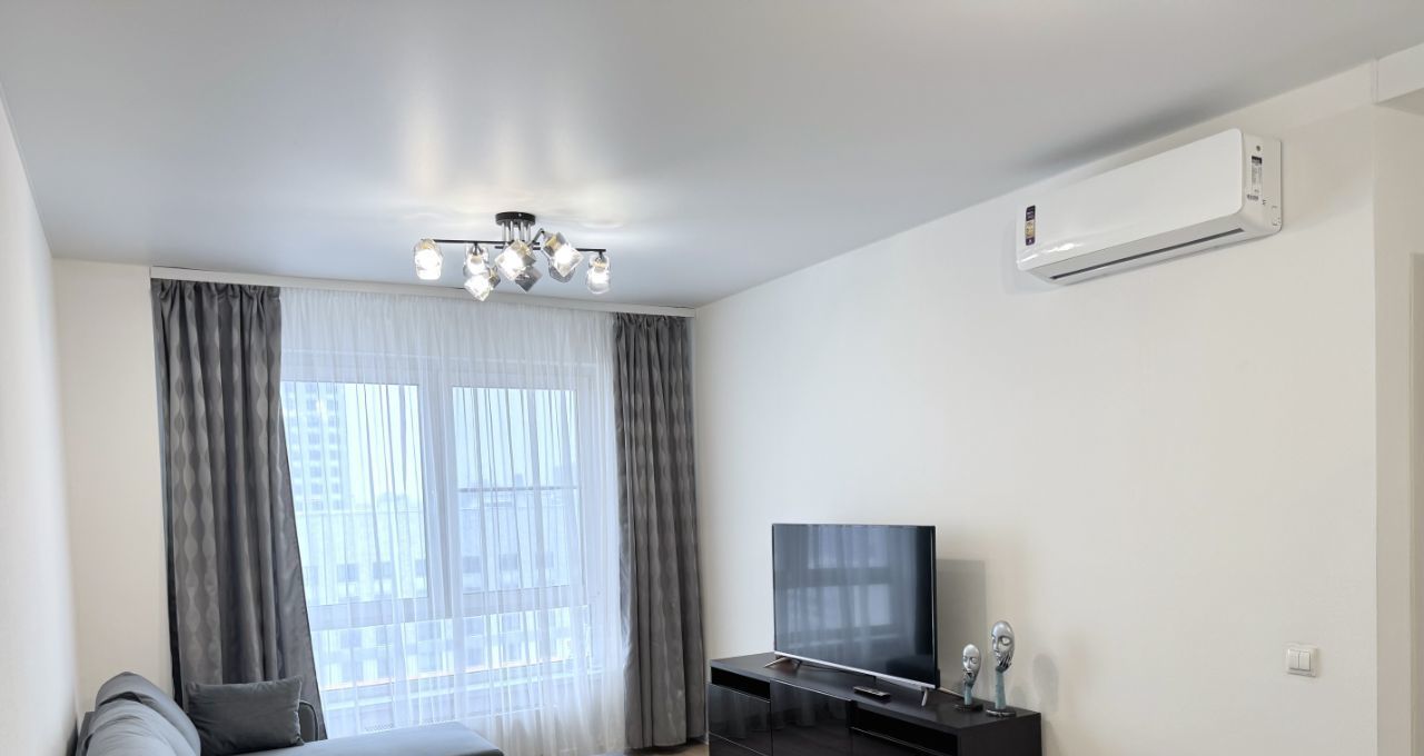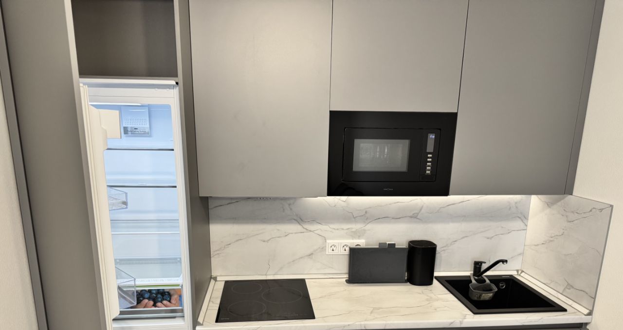 холодильник, индукционная варочная панель, духовой шкаф, стиральная машина, микроволновка, чайник, телевизор, кондиционер, вытяжка, утюг.