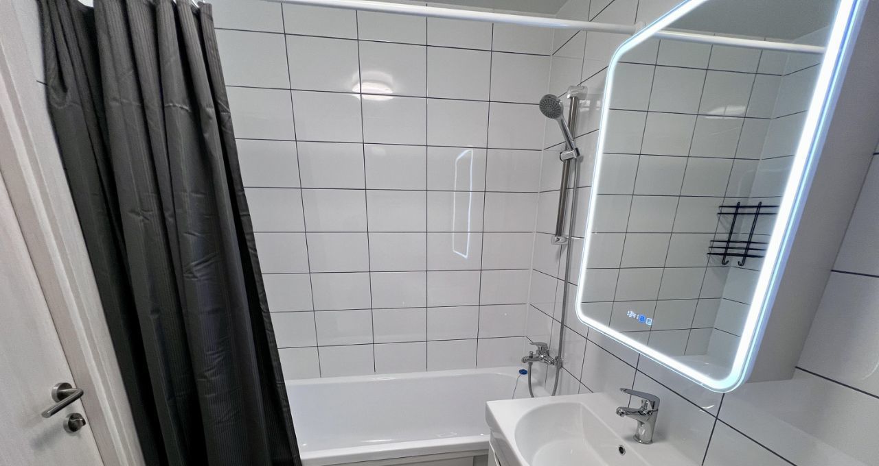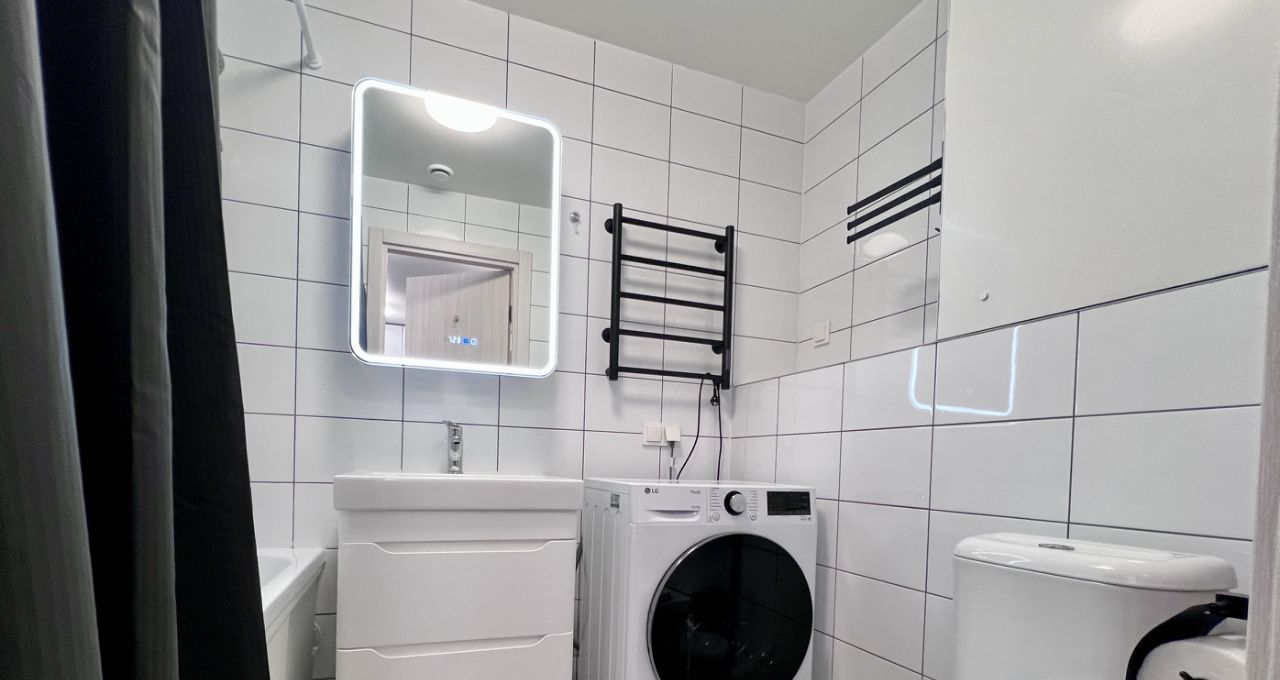Санузел с ванной, инверторная (тихая) стиральная машина с сушкой.