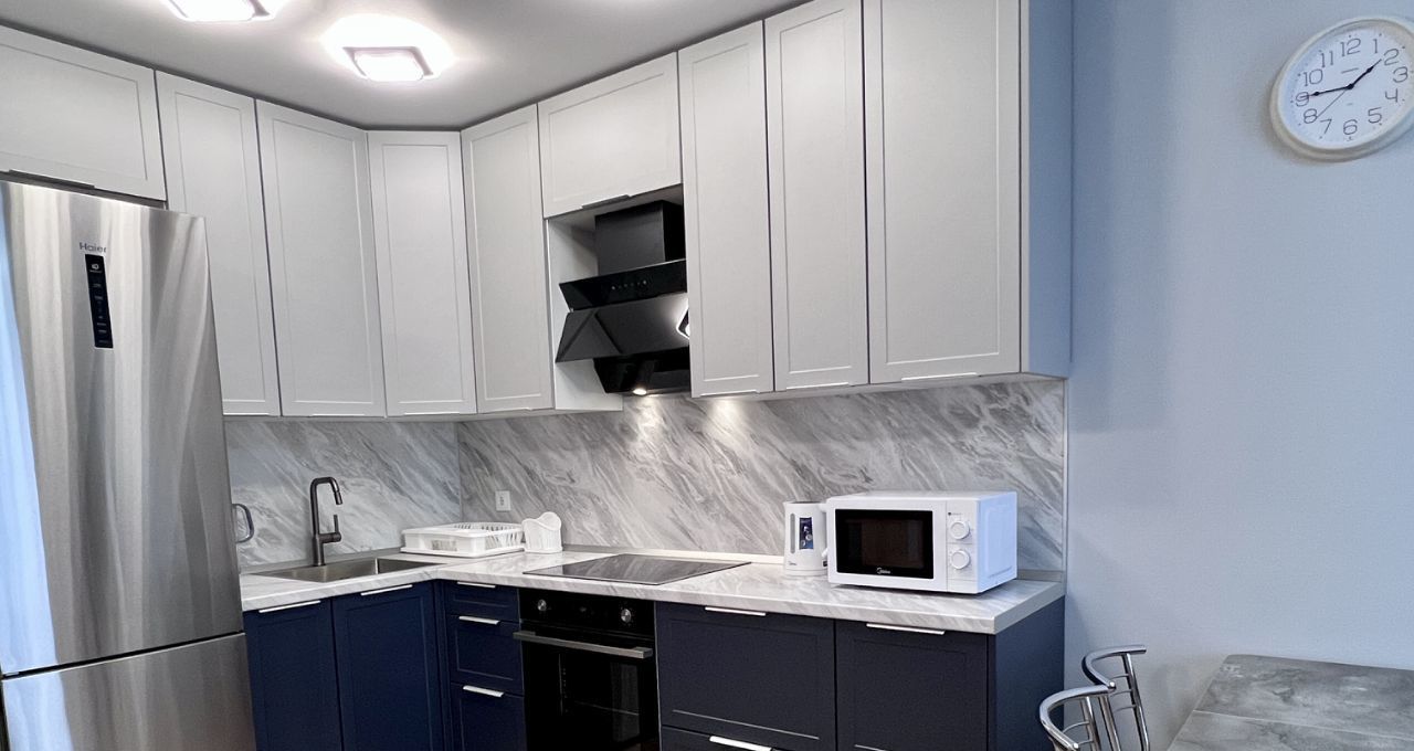Кухня изготовлена по индивидуальному заказу, вся техника новая - большой холодильник (инверторный с зоной свежести), варочная панель, духовой шкаф, СВЧ.