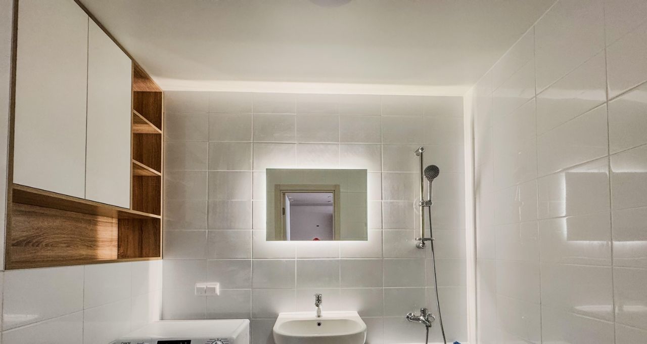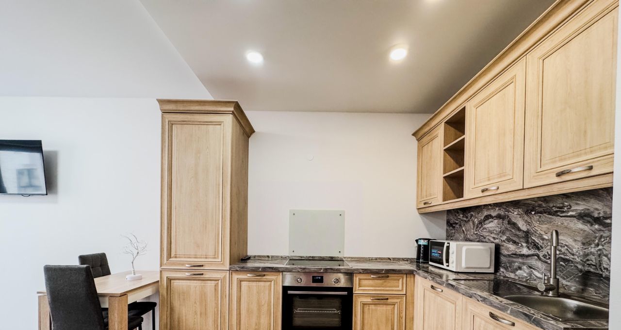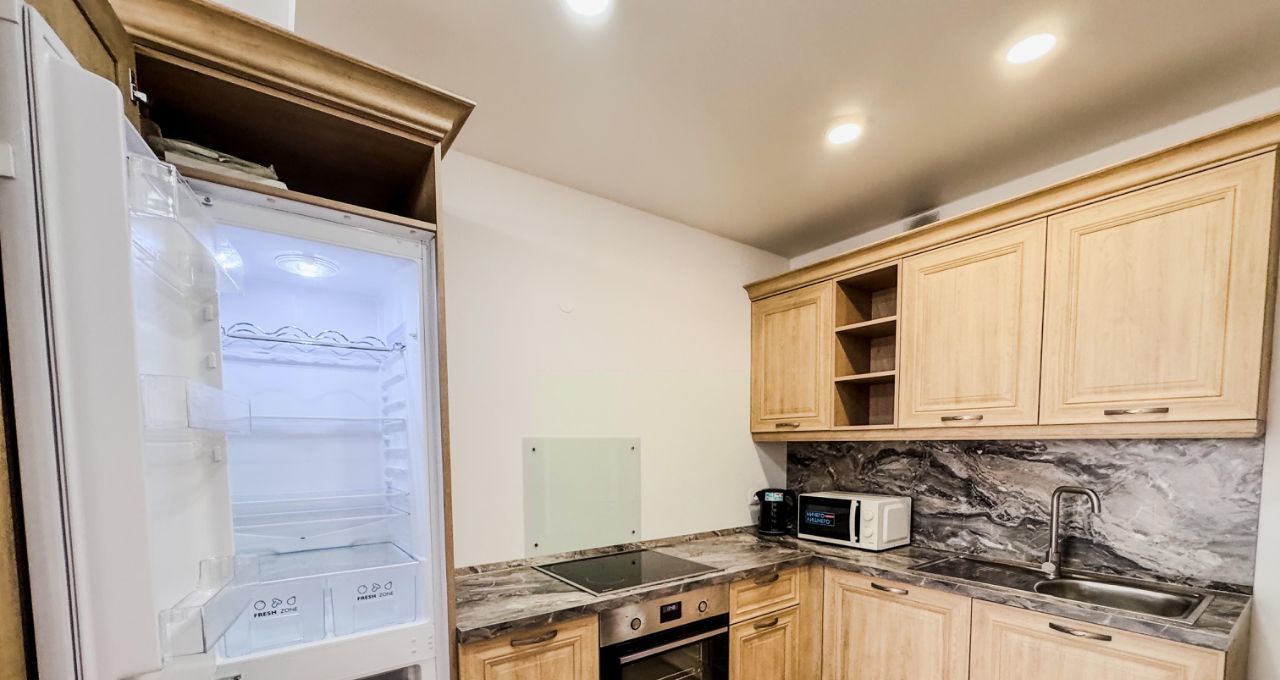 Вся современная техника уже в наличии (холодильник, варочная панель, духовой шкаф, микроволновая печь, телевизор и стиральная машина).