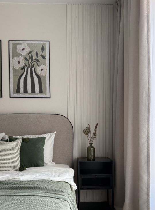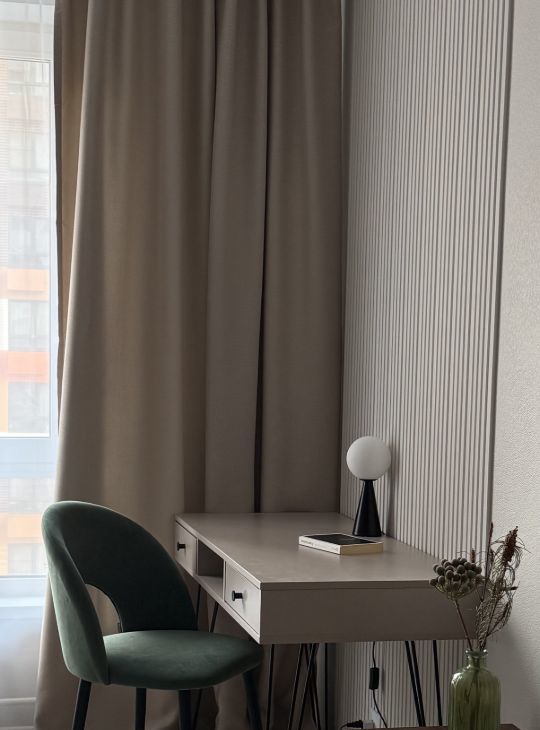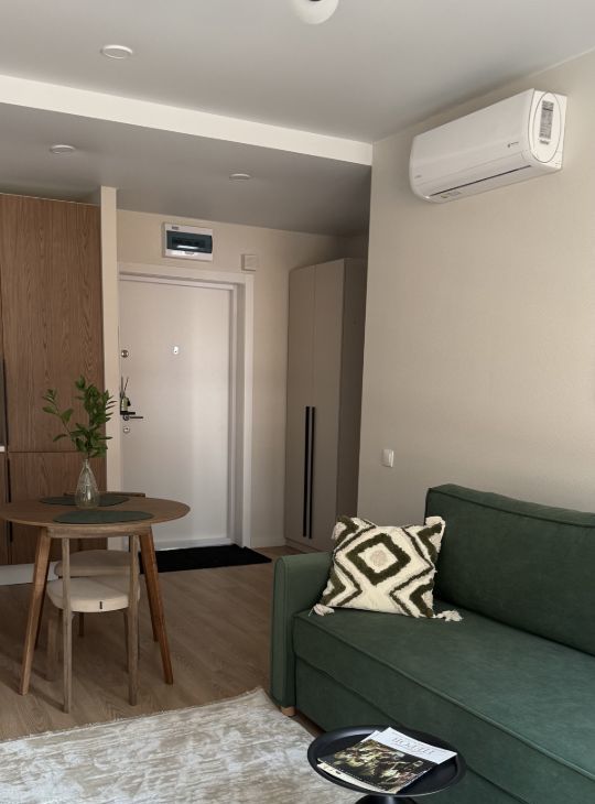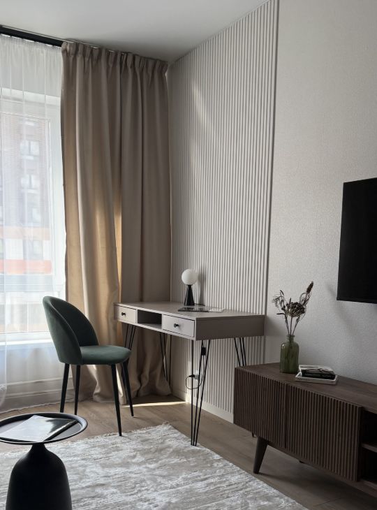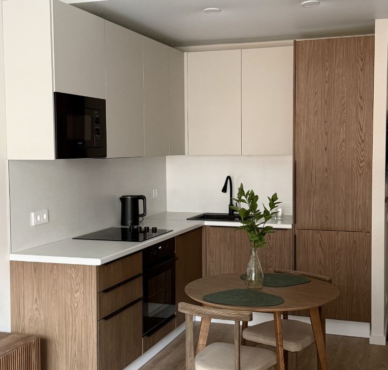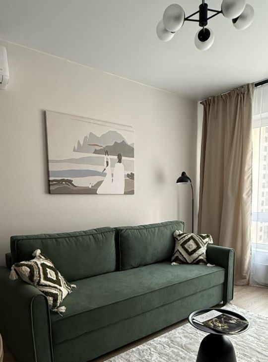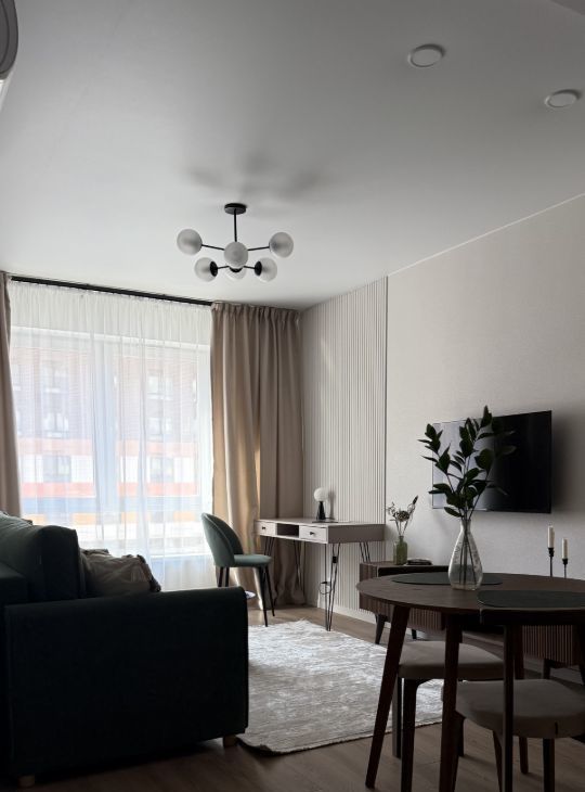 Стильная и уютная квартира, с продуманным функционалом, большой кухней-гостиной и светлой спальной комнатой.