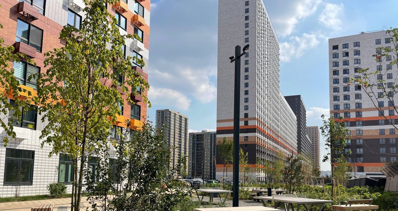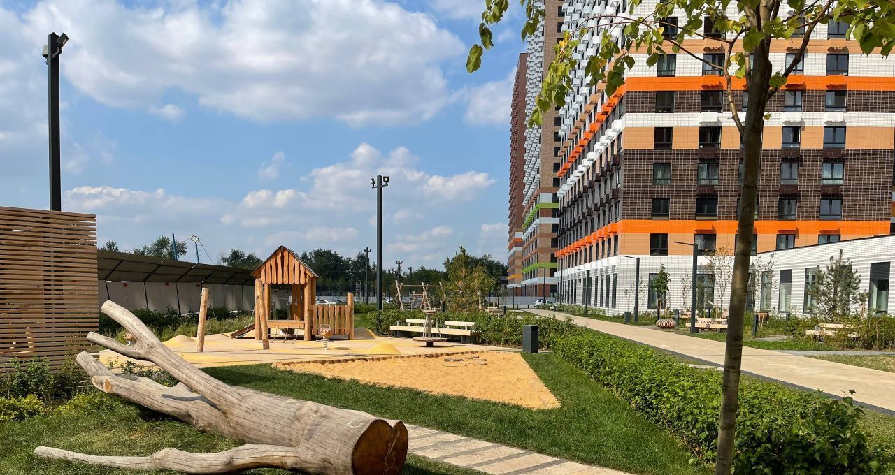Благоустроенный двор без машин: детские площадки, столы для настольного тенниса, гамаки.