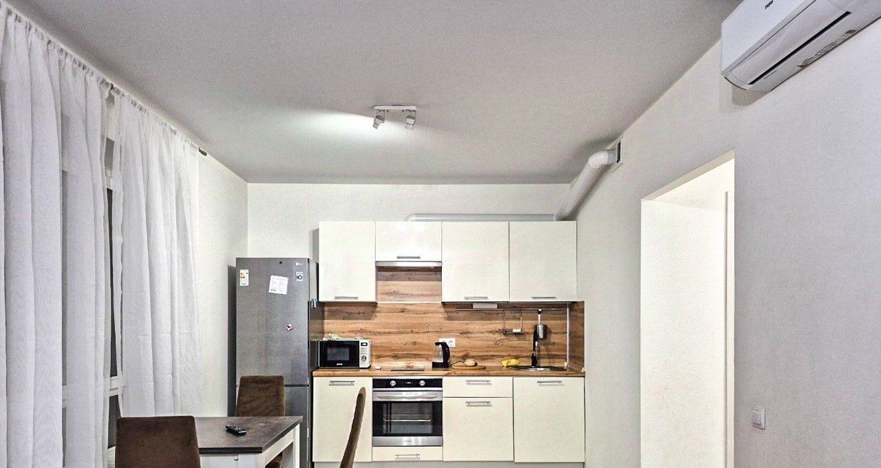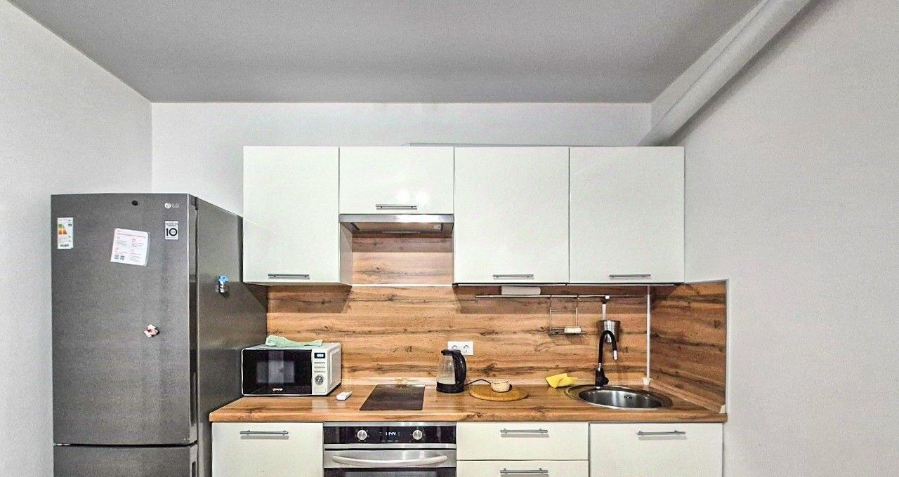 Квартира оборудована кухонным гарнитуром, мебелью и бытовой техникой. Есть: