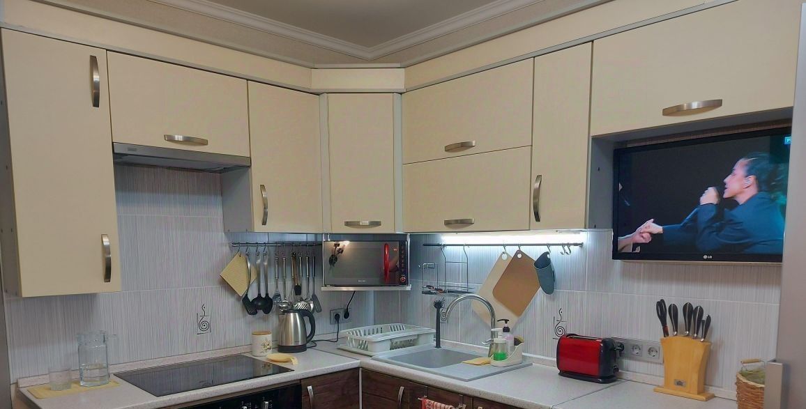 В квартире есть всё необходимое для комфортного проживания: современная кухня площадью 10 кв. м, оборудованная мебелью и техникой, в том числе холодильником. В гостиной и спальне также предусмотрена мебель. Ванная комната оснащена душевой кабиной и стиральной машиной. Для вашего удобства предусмотрен интернет и телевизор. В доме есть мусоропровод, что облегчает утилизацию отходов.