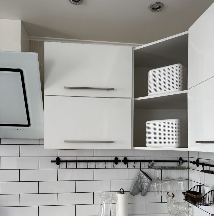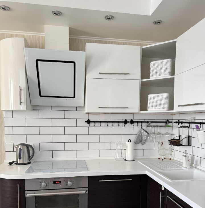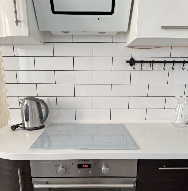 Кухня оборудована всей необходимой техникой: индукционная варочная панель, духовка, ПММ 45см, СВЧ, холодильник.
