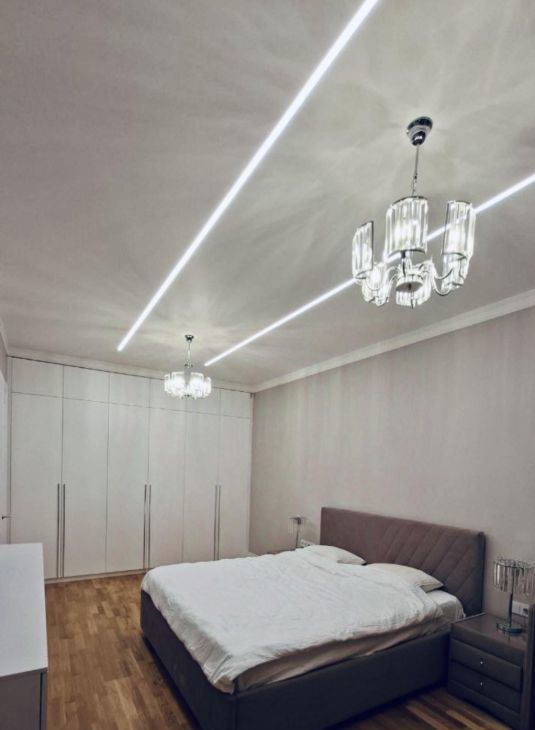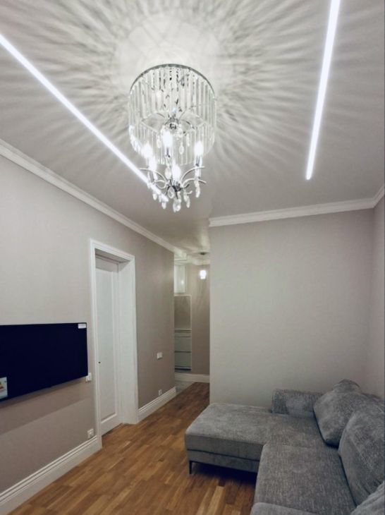 В квартире несколько типов для создания атмосферы - люстры, бра и подсветка потолков.