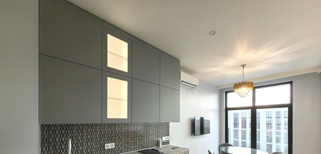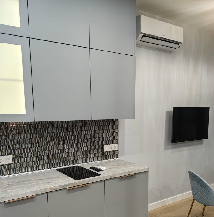 Квартира поделена на две комнаты широкой стеклянной раздвижной перегородкой, что позволяет в любой момент добиться приватности, разделив широкое пространство квартиры на гостиную и спальню. Квартира полностью меблирована: в комнатах и на кухне есть все необходимое для комфортного проживания, также имеются большие системы хранения. Установлена современная техника, включая кондиционер, холодильник, посудомоечную и стиральную машины, а также телевизор. Приятным дополнением станут два французских балкона, выходящие в тихий благоустроенный двор.
