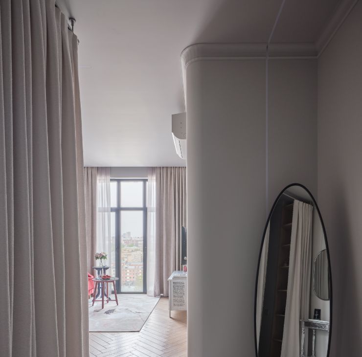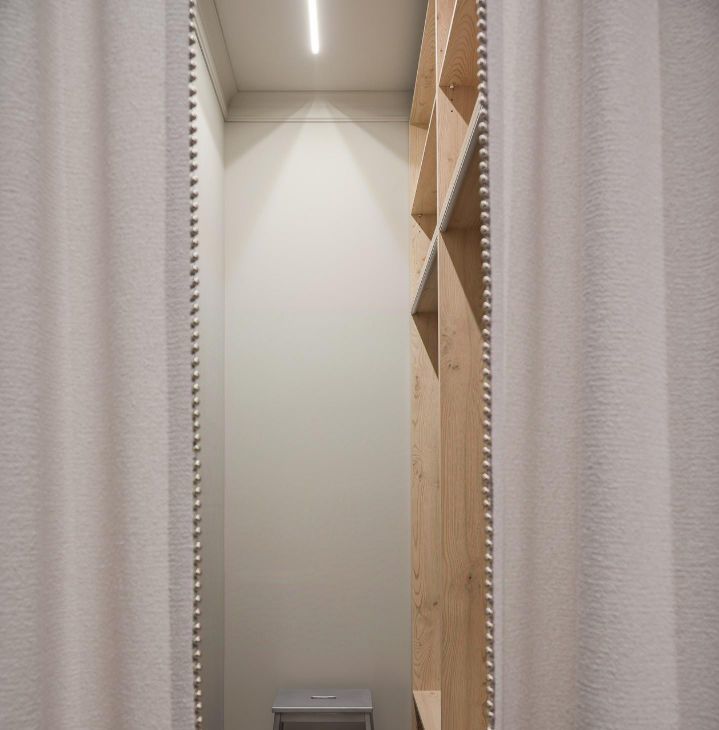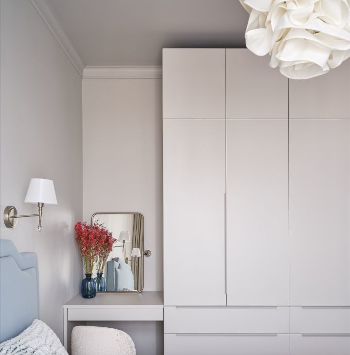 Продуманная система хранения: гардеробная и скрытые шкафы избавляют от лишнего визуального шума.