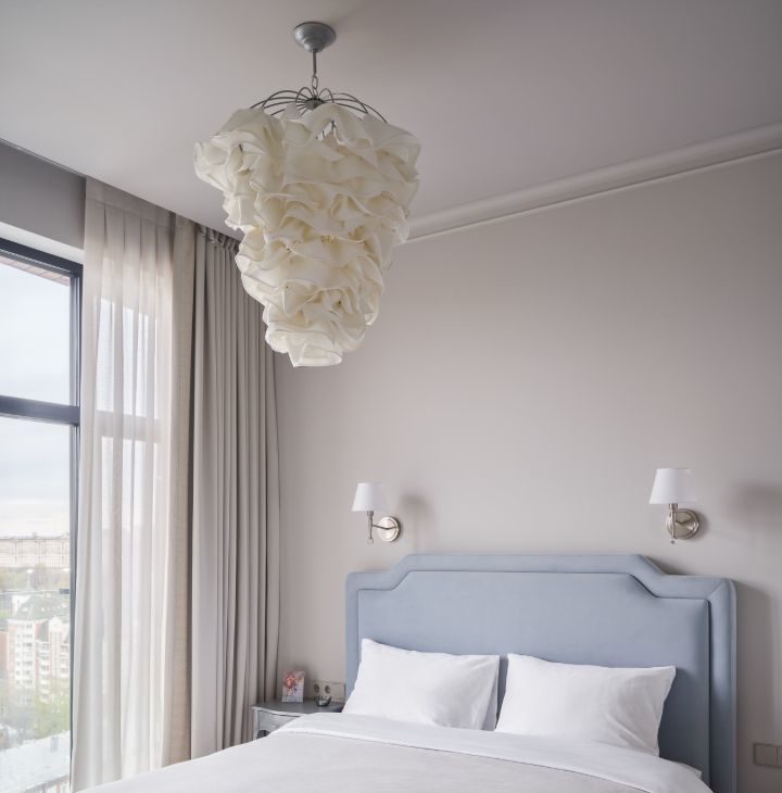 Продуманы разные сценарии освещения: от мягкого вечернего до яркого функционального: профильный свет, люстры и бра, торшер для чтения