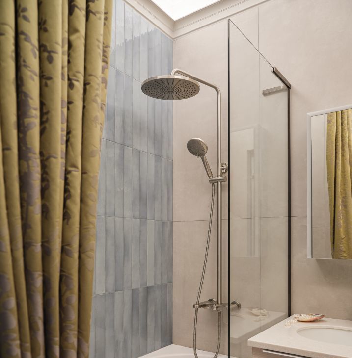 Здесь всё сделано не под аренду, а с вниманием к качеству и деталям: на полу — инженерная дубовая доска и метлахская плитка, которые приятно ощущаются под ногами и выглядят стильно вне времени.