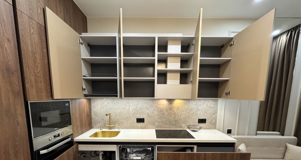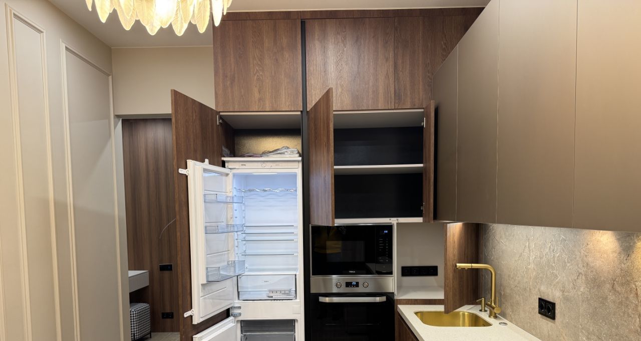 кухня оснащена всем необходимым: встроенный гарнитур (П/М машина, дух. шкаф, СВЧ, холодильник, варочная панель, вытяжка), кран с фильтром и измельчителем отходов.