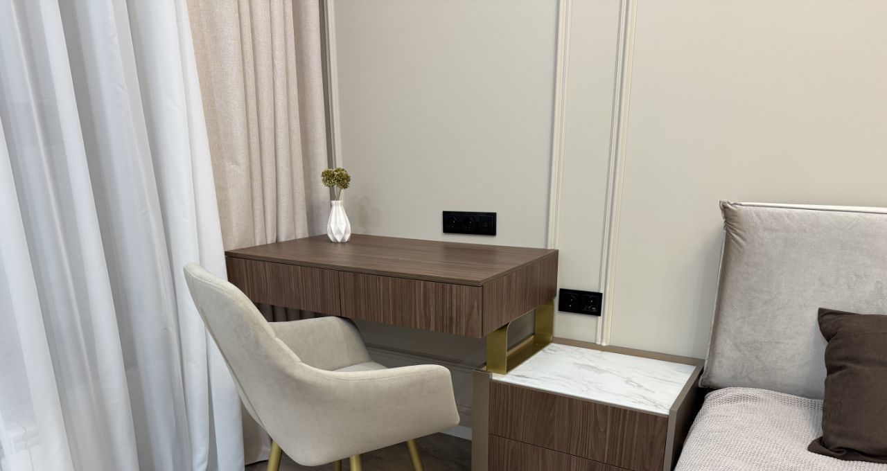 Интерьер выполнен в современном стиле: светлые оттенки с акцентными деталями.