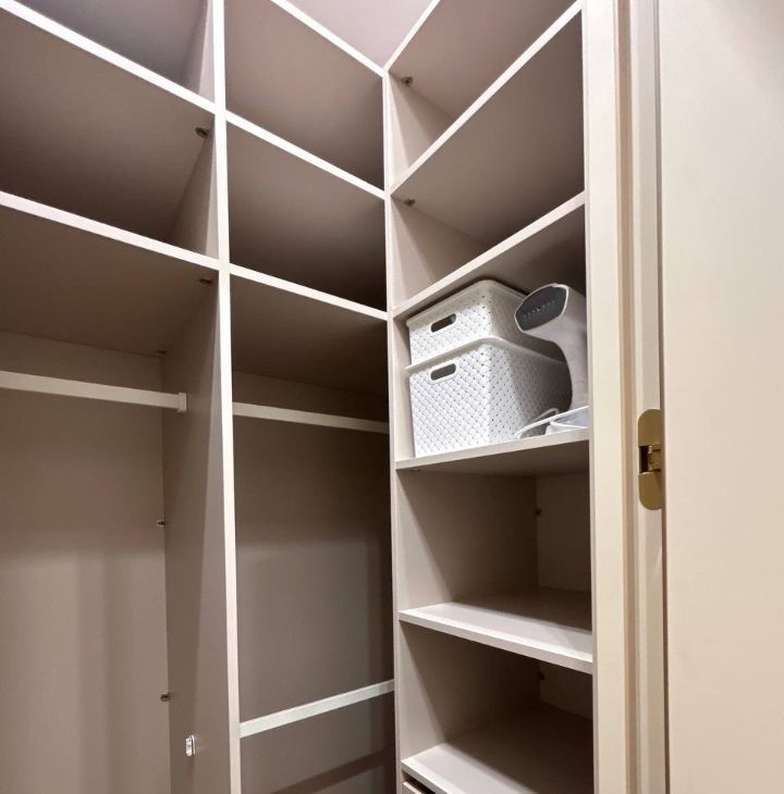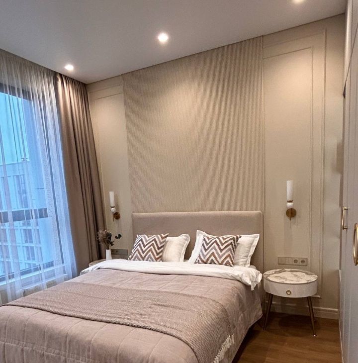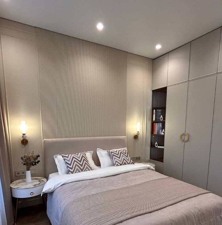 Спальня оборудована большой кроватью с ортопедическим матрасом от бренда Moon, вместительным шкафом и выделенной зоной с туалетным столиком — здесь вы будете чувствовать себя как дома.