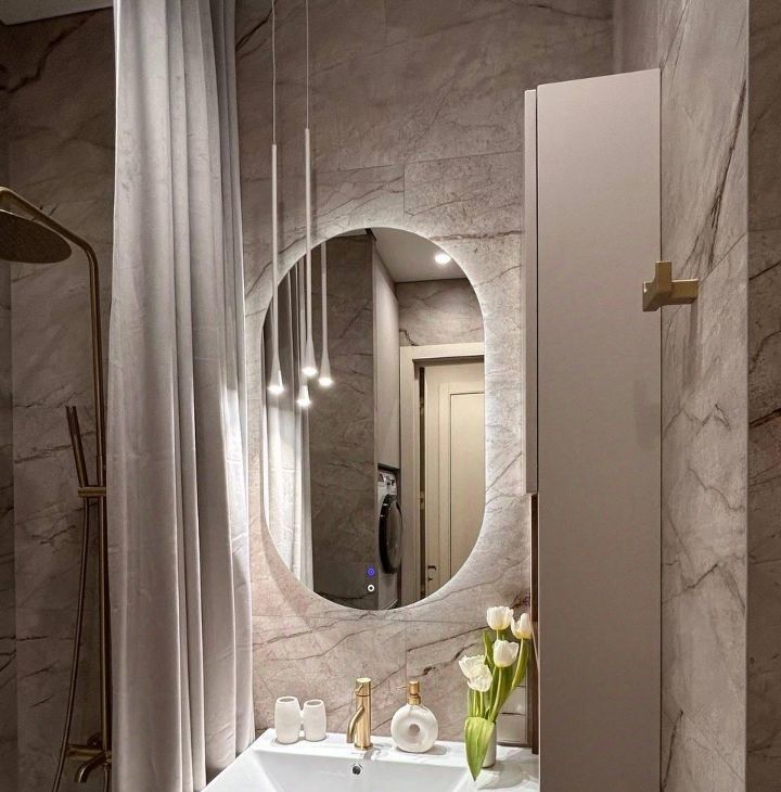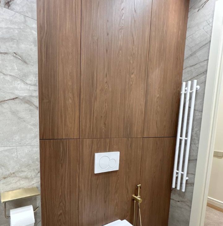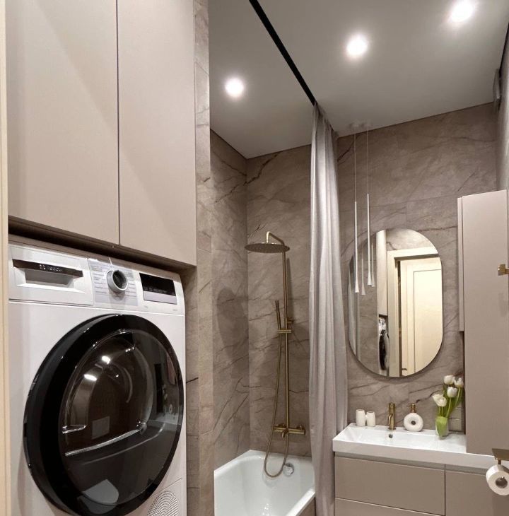 Сразу после входа — вместительная гардеробная и просторный совмещённый санузел с широкой ванной. В отдельном хозяйственном блоке установлены стиральная и сушильная машины Bosch, а также накопительный водонагреватель — горячая вода будет доступна даже при аварийных отключениях.