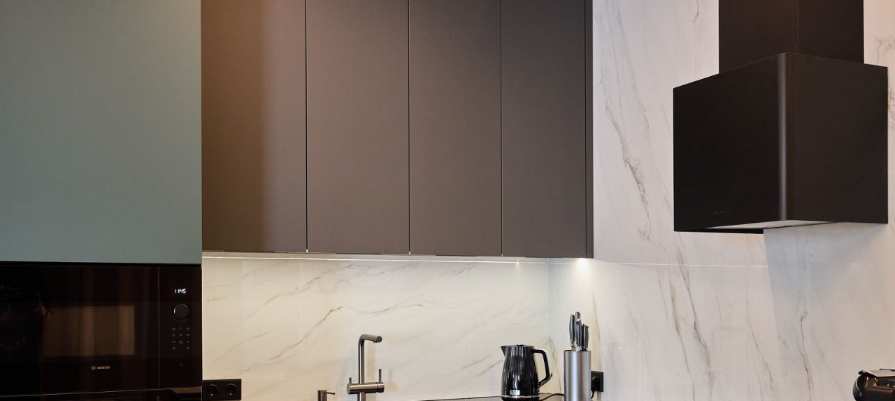 Качественная мебель в т ч кухня от компании Стильные Кухни со столешницей из кварцевого агломерата Большое количество объёмных встроенных шкафов для хранения .