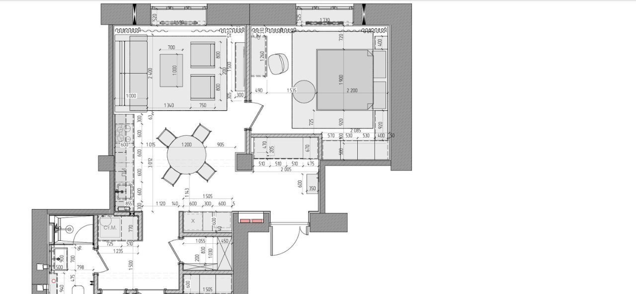 Мебель: Платяные и другие шкафы в каждом помещении. Новый кухонный гарнитур. Две кровати с ортопедическими матрасами 180*200 см. Диван-кровать со спальным местом 200 *200 см. Мебель в санузлах. Остальная мебель в перечне проекта.