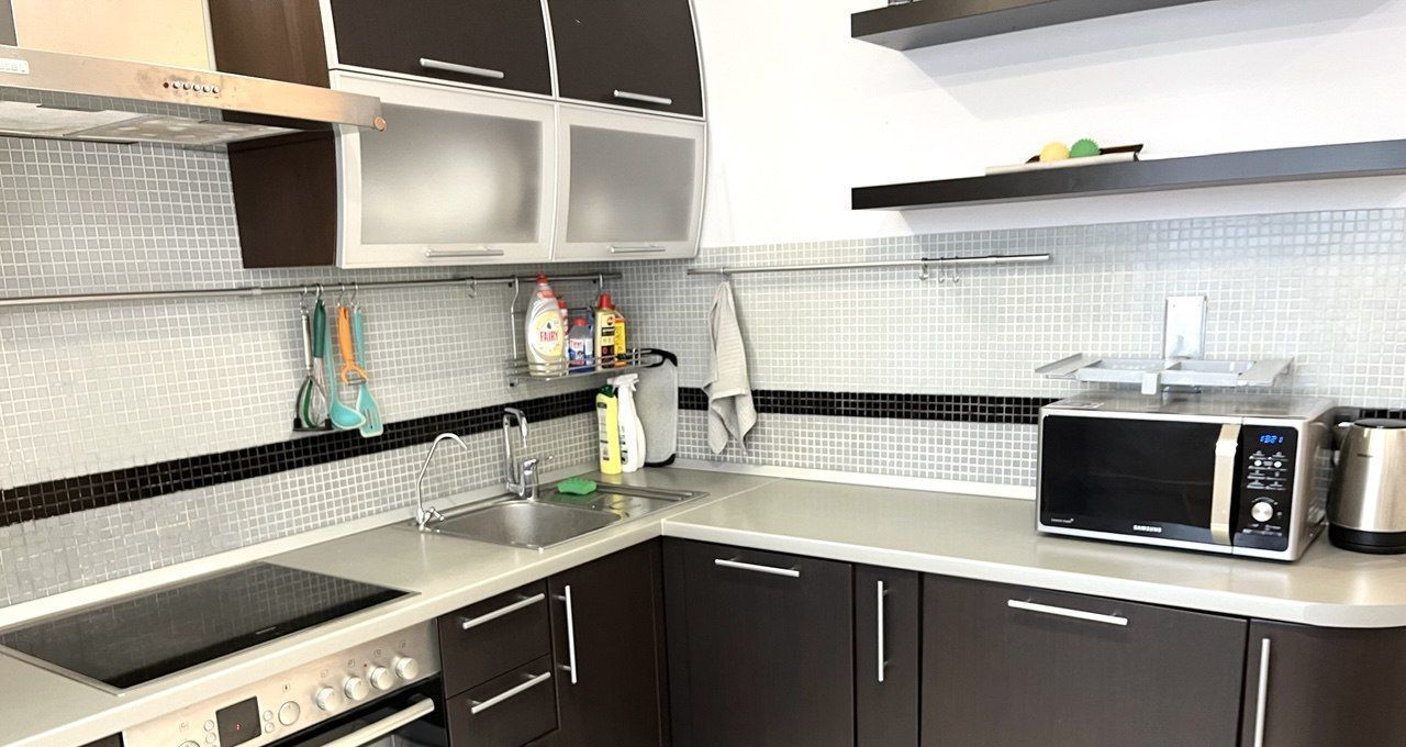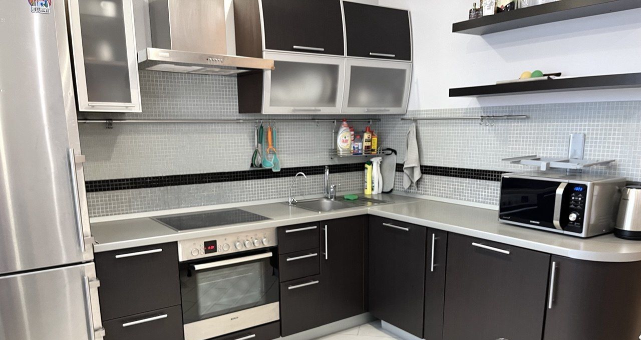 Территория ЖК- въезд под шлагбаум с подземным паркингом. Евроремонт. Просторная куня с обеденной зоной- встроенный кухонный гарнитур со всей бытовой техникой: посудомоечная машина, плита стеклокерамика, духовой шкаф, 2х-камерн холод, стир автом, СВЧ, чайник. Современная гарнитурная мебель. 1) шкаф-угловой, диван, стеллажи комод, тв. Кондиционер. 2) Двуспальная кровать, шкаф, стол компьютерный, диванчик, кушетка, полка под технику. Две лоджии- застекленные. СУ- мойдодыр с полками, Душ-кабина. В прихожей большой зеркальный шкаф- укомплектован выдвижными ящиками, полками. Подвесные потолки с подсветкой. Стены- в светлых тонах- покраска. Пол- плитка, паркет. Просторная светлая квартира. Металлич дверь. Чистый подъезд. Консьерж. Ухоженная придомовая территория. Без животных. Без регистрации.