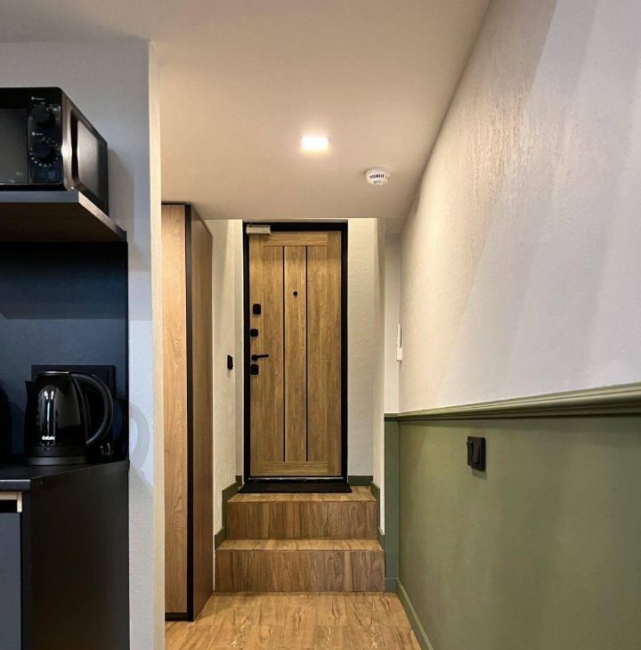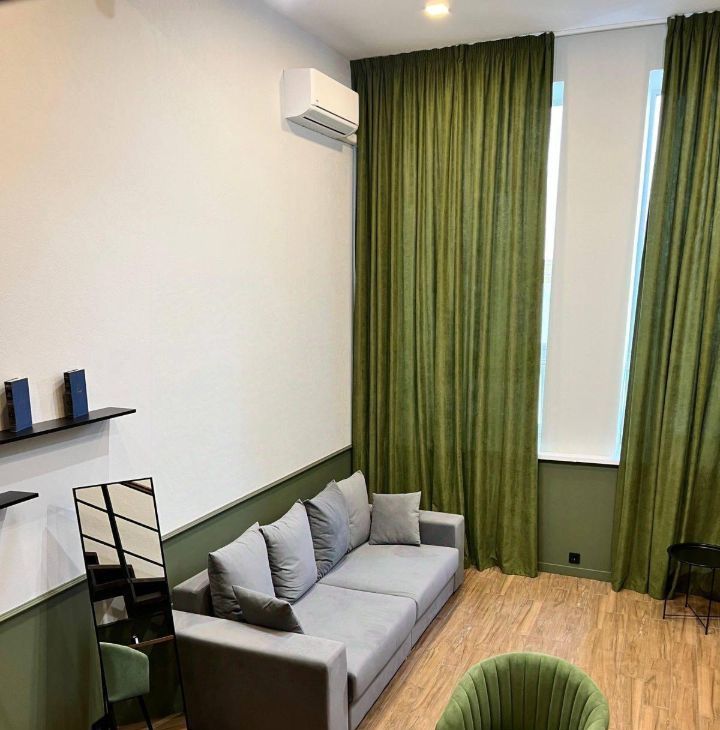 Квартира выполнена в стиле евроремонт, что придаёт ей современный и опрятный вид. Внутри есть вся необходимая мебель: на кухне и в комнате, а также техника для комфортного проживания — кондиционер, холодильник, телевизор и стиральная машина. Санузел совмещённый, оборудован современной душевой кабиной. Окна выходят во двор, поэтому в квартире тихо и спокойно.