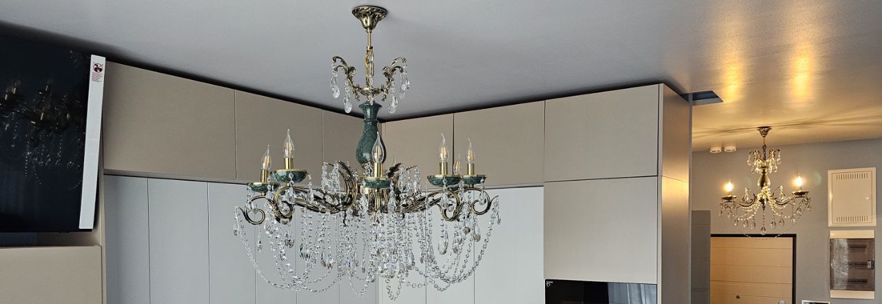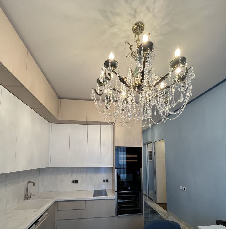 Кухня оснащена всем необходимым оборудованием, включая варочную панель, духовой шкаф, винный шкаф, посудомойка, микроволновка, холодильник с морозилкой.