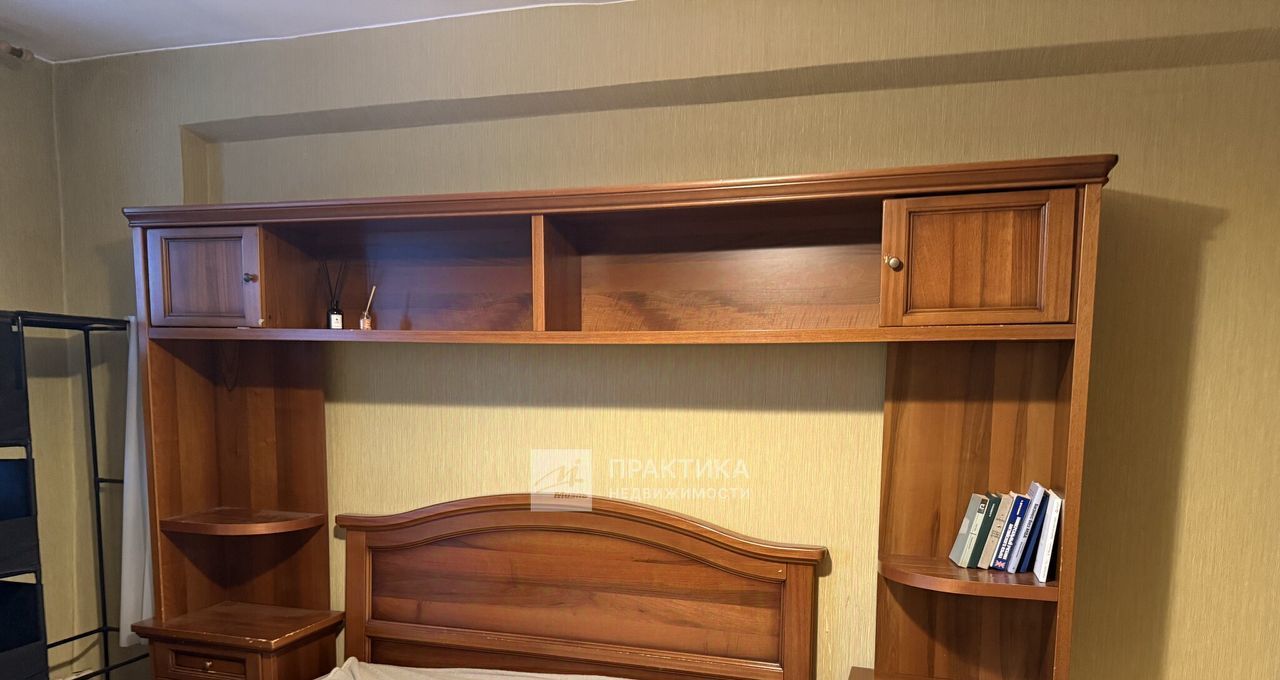 В спальне двуспальная кровать и большуая вместительная система хранения;