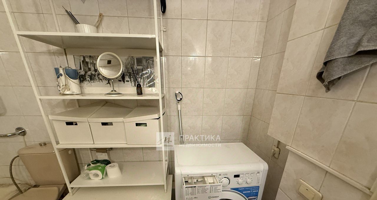 Большой совмещенный санузел с ванной, стиральной машиной и полками для хранения