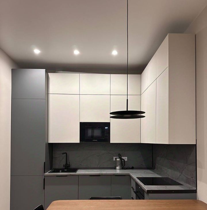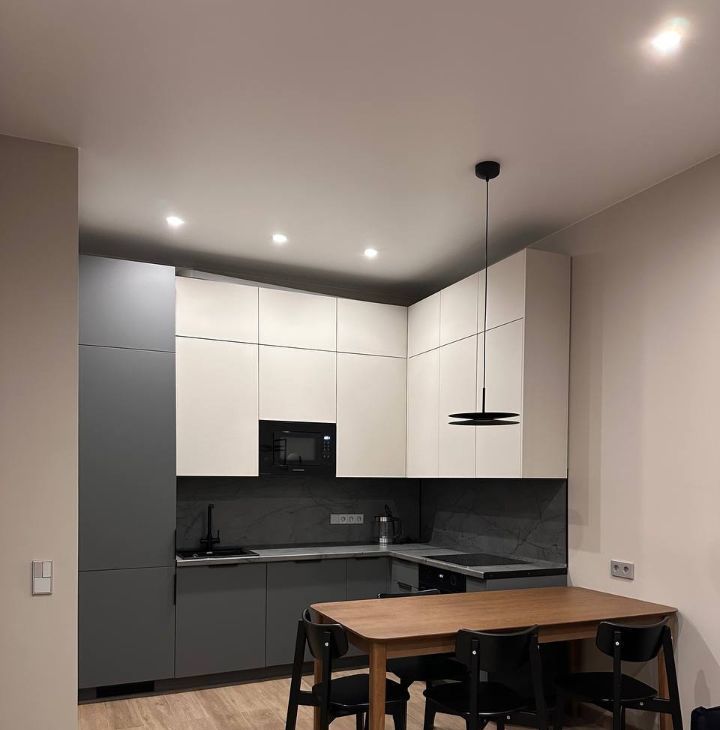 Кухня: холодильник, варочная панель, вытяжка, посудомоечная машина, духовой шкаф, микроволновка, электрический чайник.