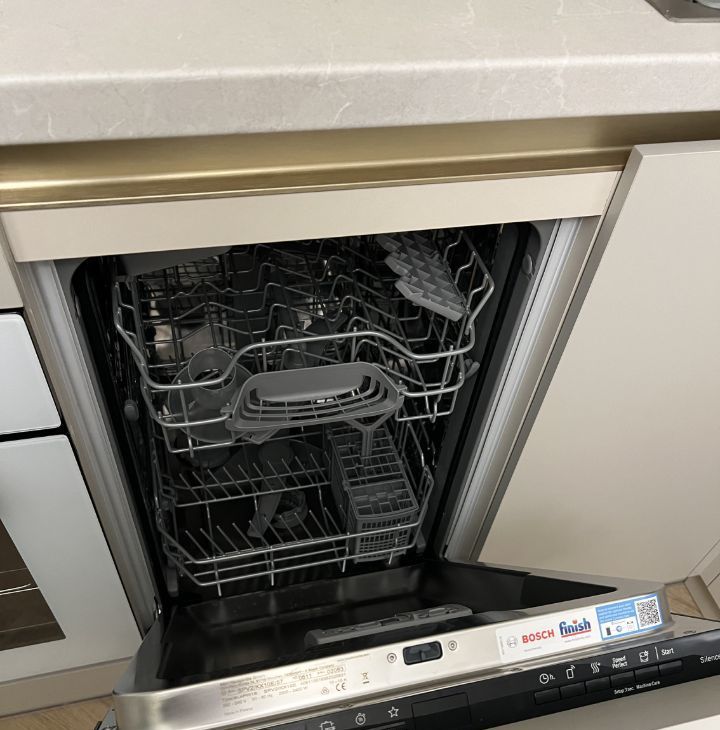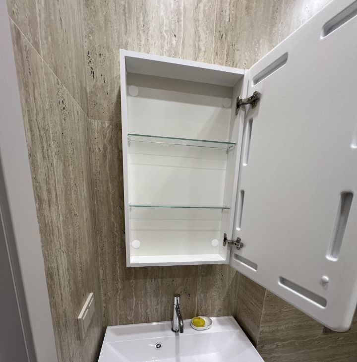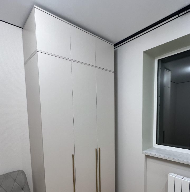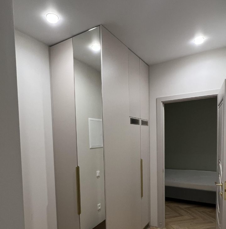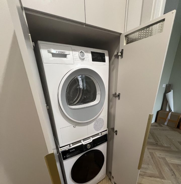 - Большой вместительный шкаф состоящий из двух частей, первая часть с зеркальной дверцей для одежды/обуви, вторая часть со встроенными стиральной (Tuvio, 8кг) и сушильной (Bosch, 8кг) машинами в колонне.