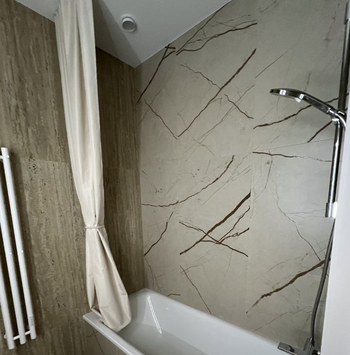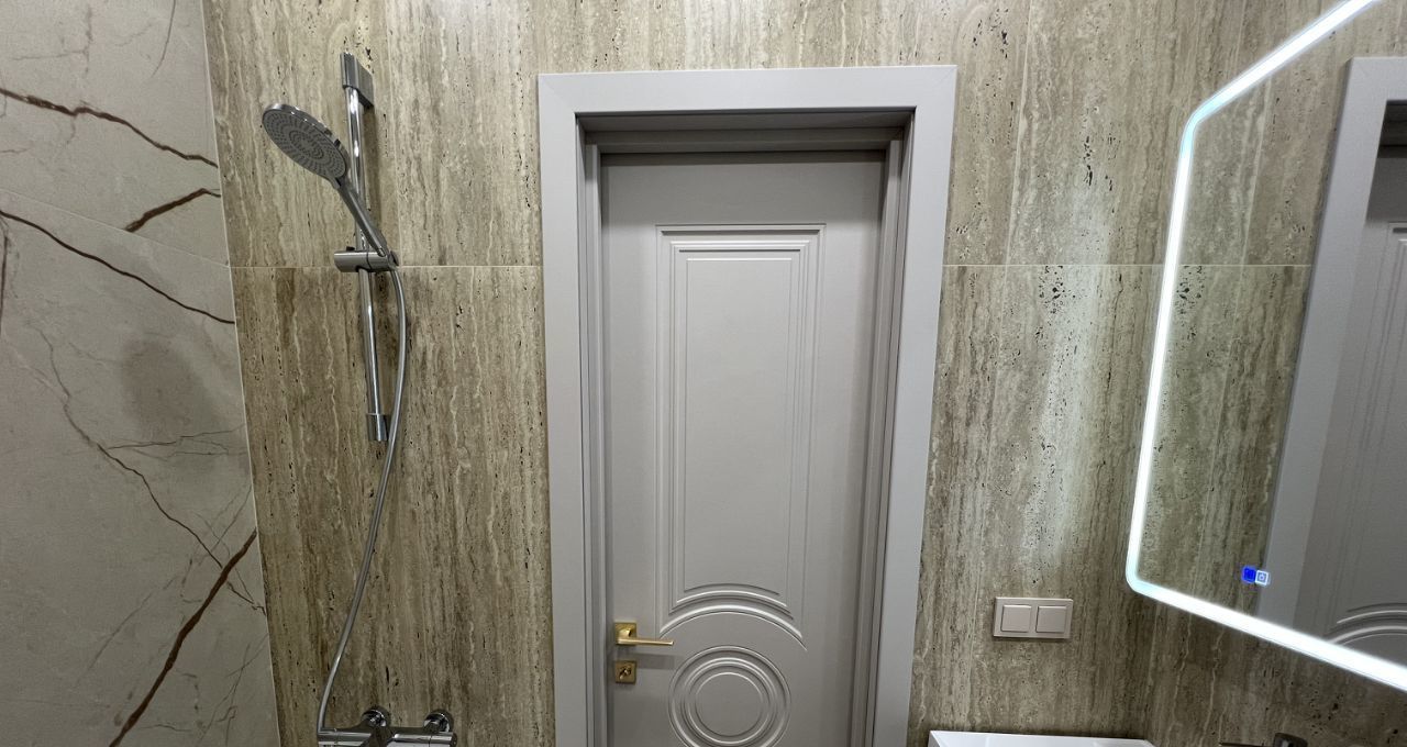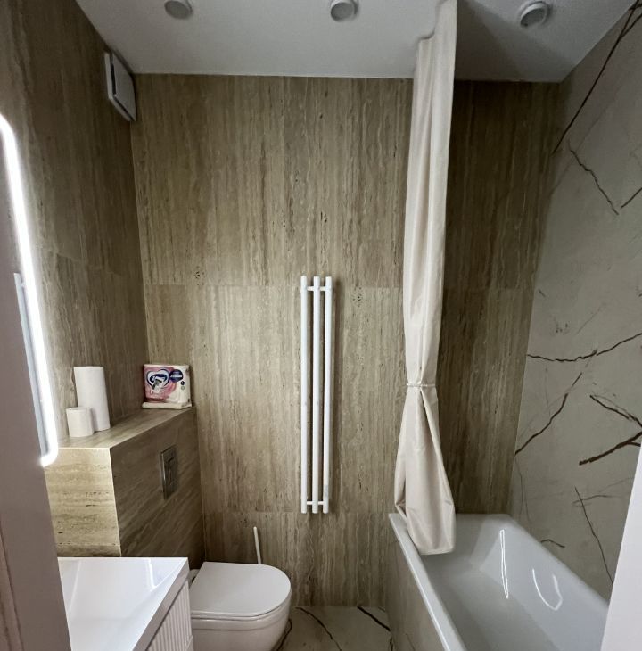 - Ванна Kaldewei, смеситель с термостатом Kaiser, инсталляция Grohe, электрический полотенцесушитель, зеркальный шкаф с подсветкой и подогревом, тумба с раковиной и выдвижными ящиками.