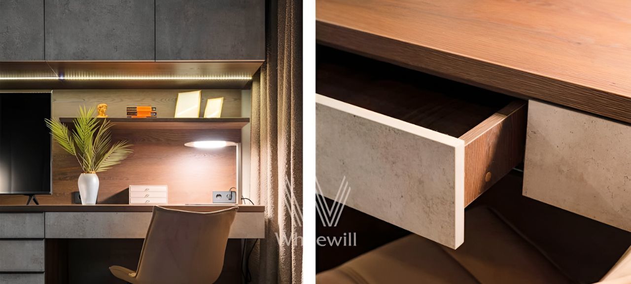 Планировка: кухня-гостиная с биокамином, спальня с рабочей зоной и ванной комнатой, санузел с душевой, большая гардеробная.