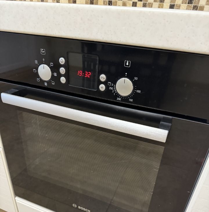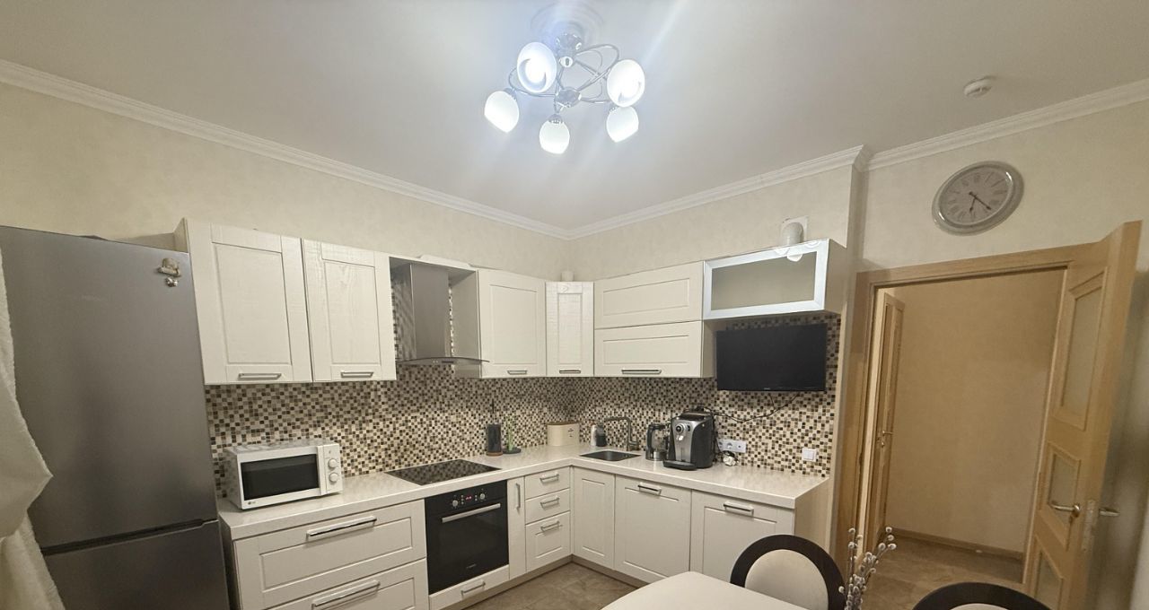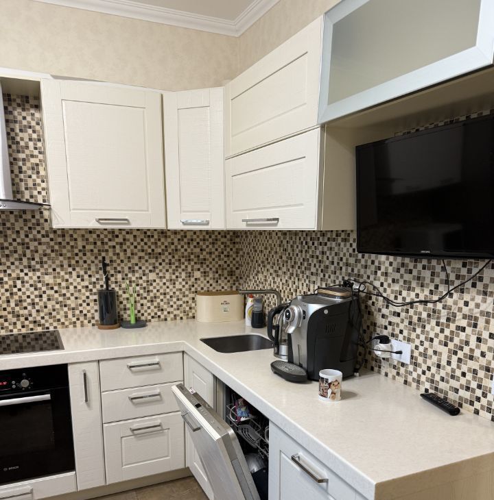 Кухня 11 кв м , оснащена бытовой техникой Bosh духовой шкаф, варочная панель, большая посудомоечная машина и тд. Кухня в эмали, каменная столешница. Установлен накопительный фильтр, смеситель Omoikiri с выводом для фильтрованной воды.