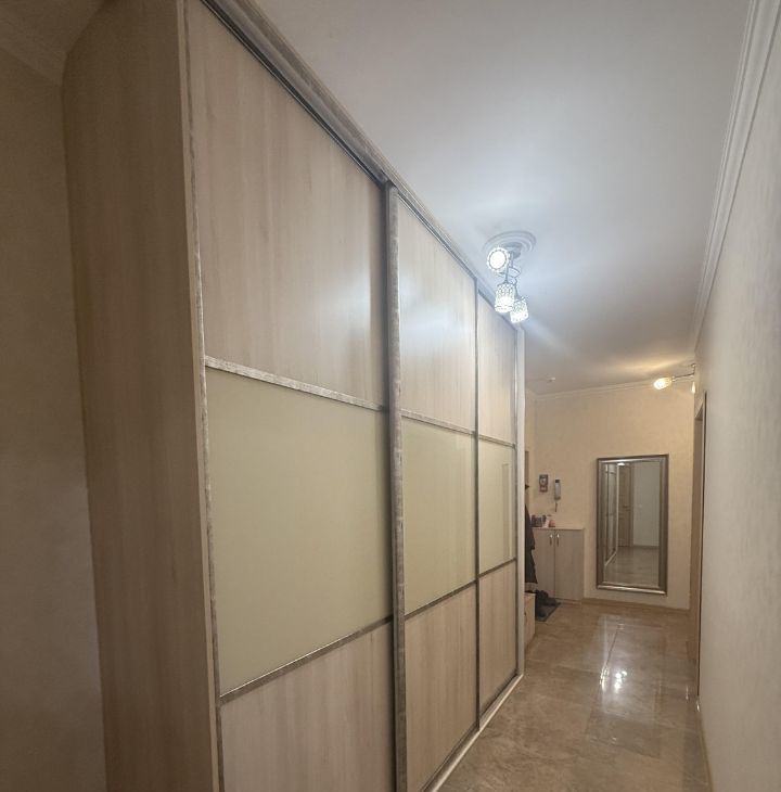 Просторная прихожая с большим шкафом под верхнюю одежду, гладильную доску, обувь и чемоданы.