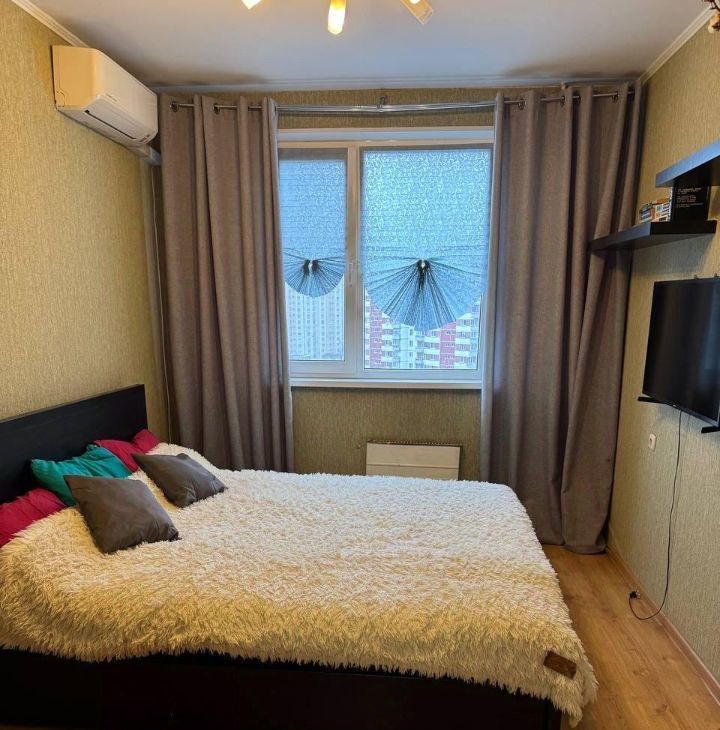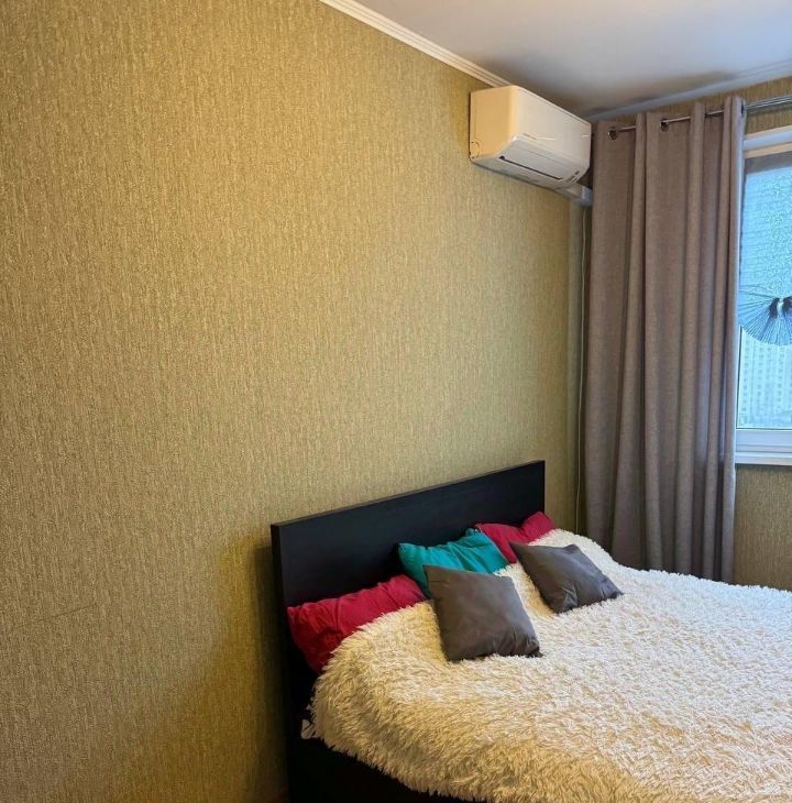 В квартире есть: двуспальная кровать, двуспальный диван, два телевизора, шкаф-купе 2 шт., стенка, в каждой комнате кондиционер, кухонный гарнитур, варочная панель, холодильник, СВЧ печь, электрочайник, стол кухонный, стулья, посуда, стиральная машинка, пылесос, утюг, прихожая.