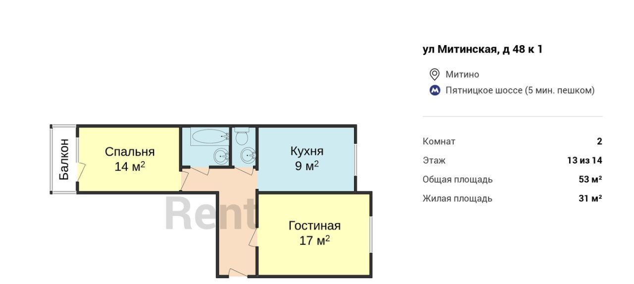 2-к кв. Москва Митинская ул., 48К1 (53.0 м²)