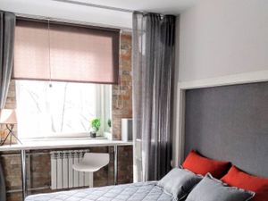 Гостиная предлагает уютное пространство для отдыха, оборудованное кожаным диваном, креслом и современным телевизором. Спальня станет вашим личным уголком для спокойного отдыха с большой двуспальной кроватью и вместительным шкафом-купе. Также общая ванная комната с джакузи и душевой кабиной обеспечит вам максимальный комфорт.